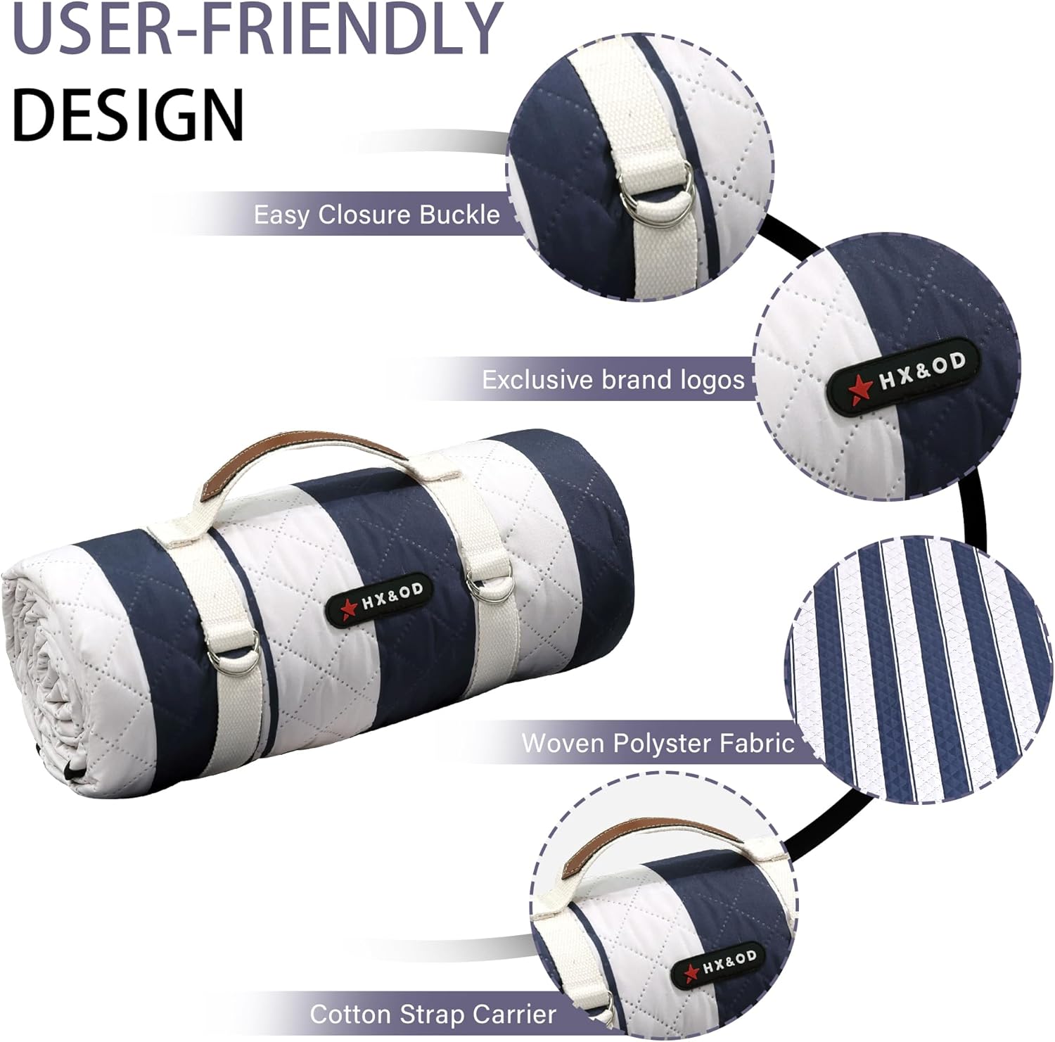 HX&OD Outdoor Picnic Blanket Extra Large, 80''*80'' Waterproof Picnic Mat with Stakes Foldable Camping Blanket Portable with Carry Strap for Beach Mat (Blue& White, 80''*80'')