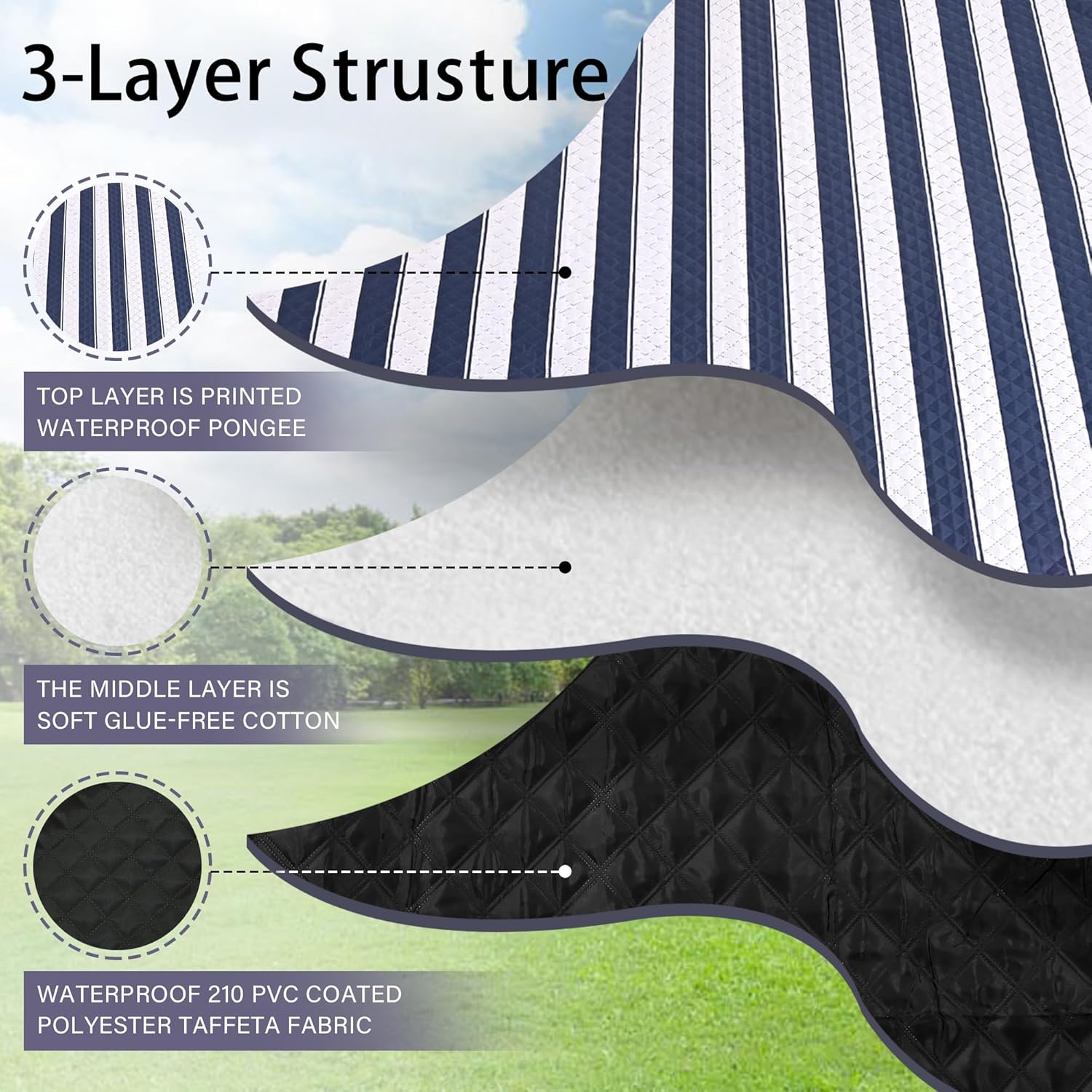 - ☀ 【Soft and Durable with 3-Layers】The picnic blanket top layer is printed waterproof pongee, the middle layer is soft glue-free cotton, and the bottom layer is waterproof black Oxford cloth. Perfectly suitable for siting or lying on grass, beach, floor or any kindly of surface, giving you soft and comfortable feelings.