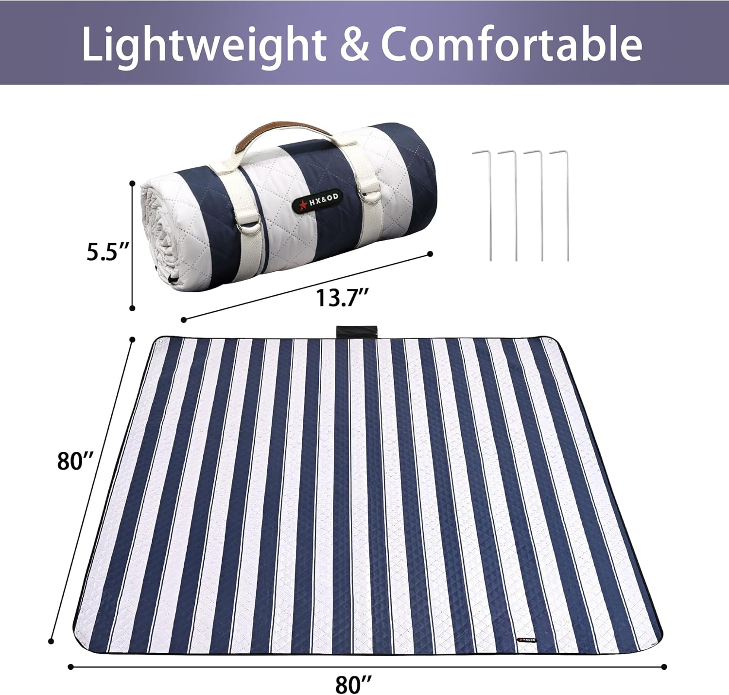- ☀【Easy to Fold & Lightweight】Large picnic blanket can shrink down to a very portable size of 12"L x 4"W x 4"H. This Picnic blanket with stakes will not loose easily and take too much space. The weight of the mat is only 1.8lbs, you can fold it with simple steps, carry or store it anywhere you want.