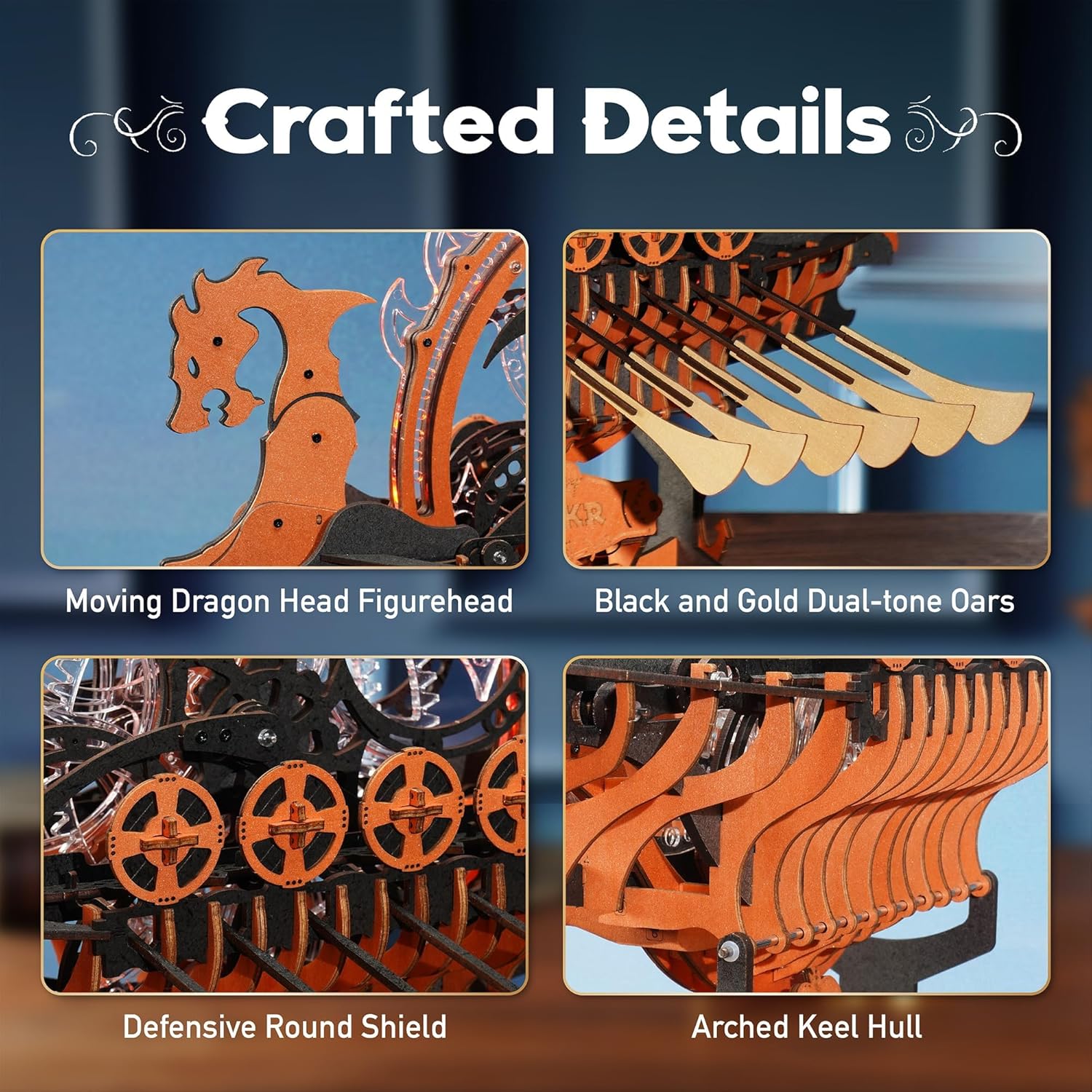 - [ROKR Viking Dragon Ship] Inspired by 8th-century Viking ships, this wooden 3D puzzle features a striking fire dragon design with 12 automatic paddles and a flywheel. Orange lights add a cool effect, making it a unique decor piece or gift.