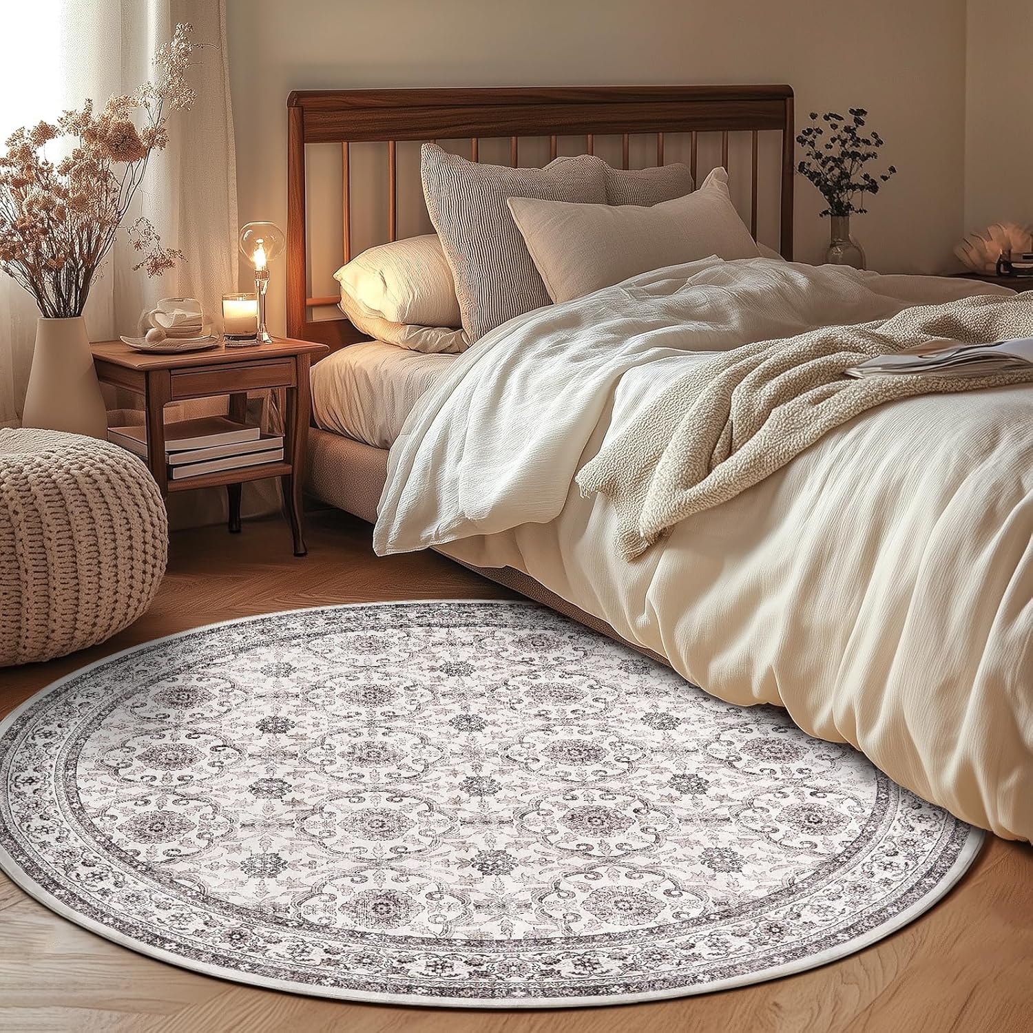 jinchan Round Rug 4ft Washable Circle Soft Rug - Low Pile Vintage 4'Round Indoor Beige Floral Print Stain Resistant Boho Carpet Ultra-Thin Non-Slip for Entryway Nursery Bedroom Dining Room Kitchen