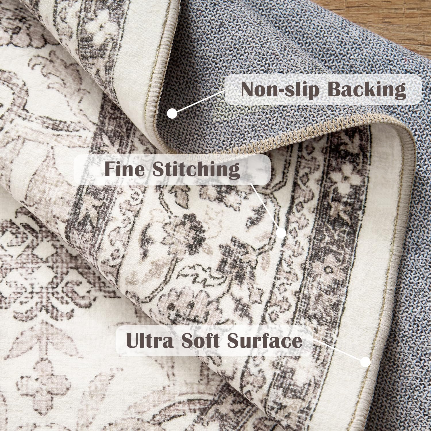 jinchan Round Rug 8ft Washable Circle Soft Rug - Low Pile Vintage 8'Round Indoor Beige Floral Print Stain Resistant Boho Carpet Ultra-Thin Non-Slip for Living Room Bedroom Dining Room Kitchen