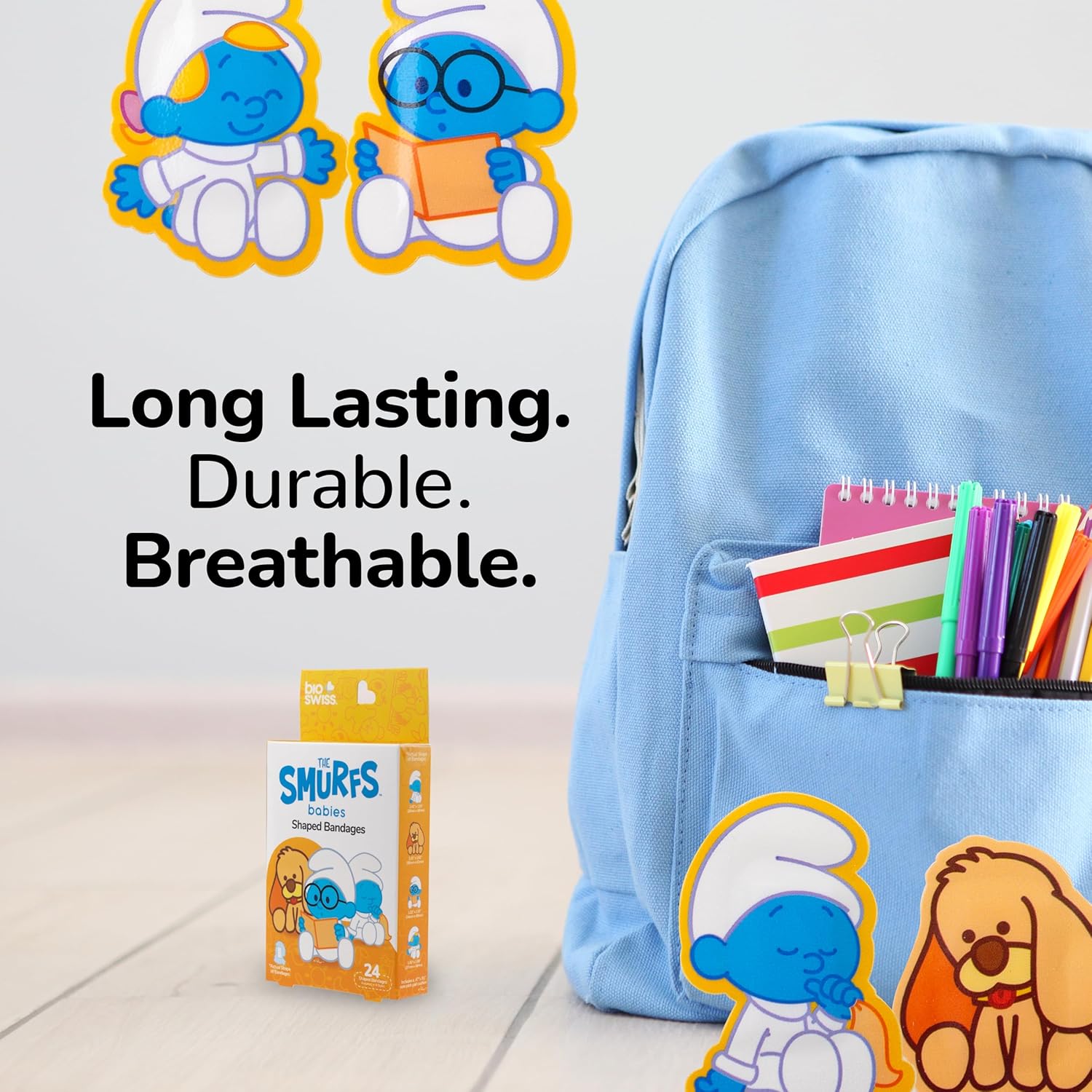 BioSwiss Bandages, The Smurfs Baby Smurf Shaped Self Adhesive Bandage, Latex Free Sterile Wound Care, Fun First Aid Kit Supplies for Kids and Adults, 24 Count Box