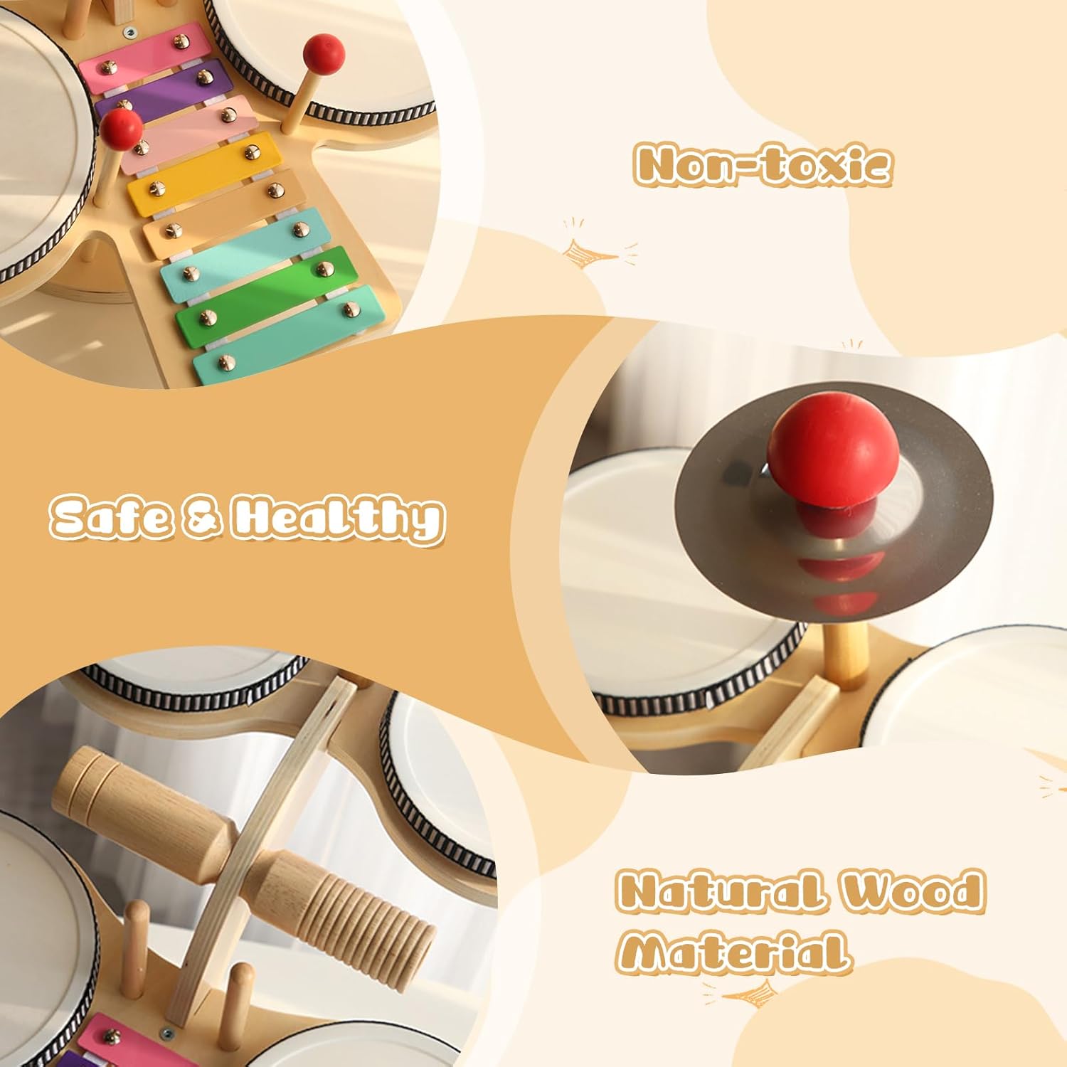 - [SAFE AND HIGH QUALITY MATERIALS]: The KIDS Drum Set is CPC and CE certified. And it is made from high quality natural wood, which is free from paint and coatings.Each corner has adopted a rounded process and there will be no sharp or rough parts to hurt your baby's hands.It is the perfect learning music toy for boy musicians and girl musicians, inspire your child's musical talent by happily drumming and playing the xylophone.