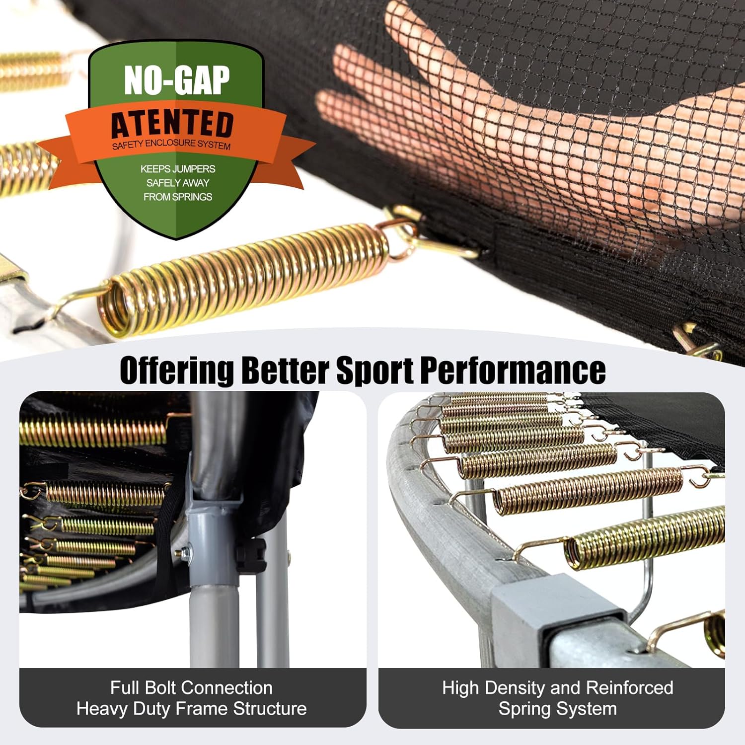 - Reinforced Frame Structure and Spring System: The trampoline features high-density spring system, prioritizing safety and providing a superior bouncing experience. The heavy-duty U-shaped steel frame and trampoline stakes provides extra stability.