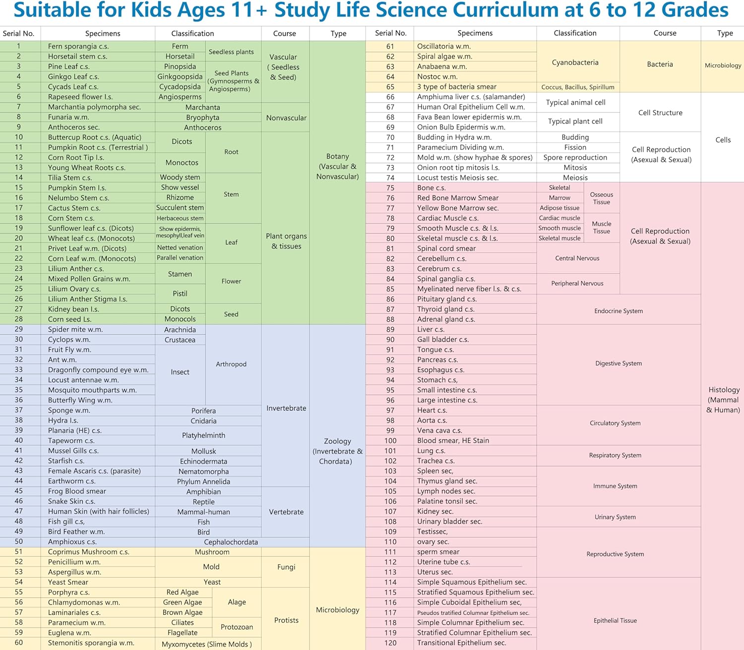 - Intended Use: The 120 microscope slides with specimens suitable for science class, homeschool & biology curriculum, various samples covering different topics like biology, botany, zoology, histology, microbiology, cells.