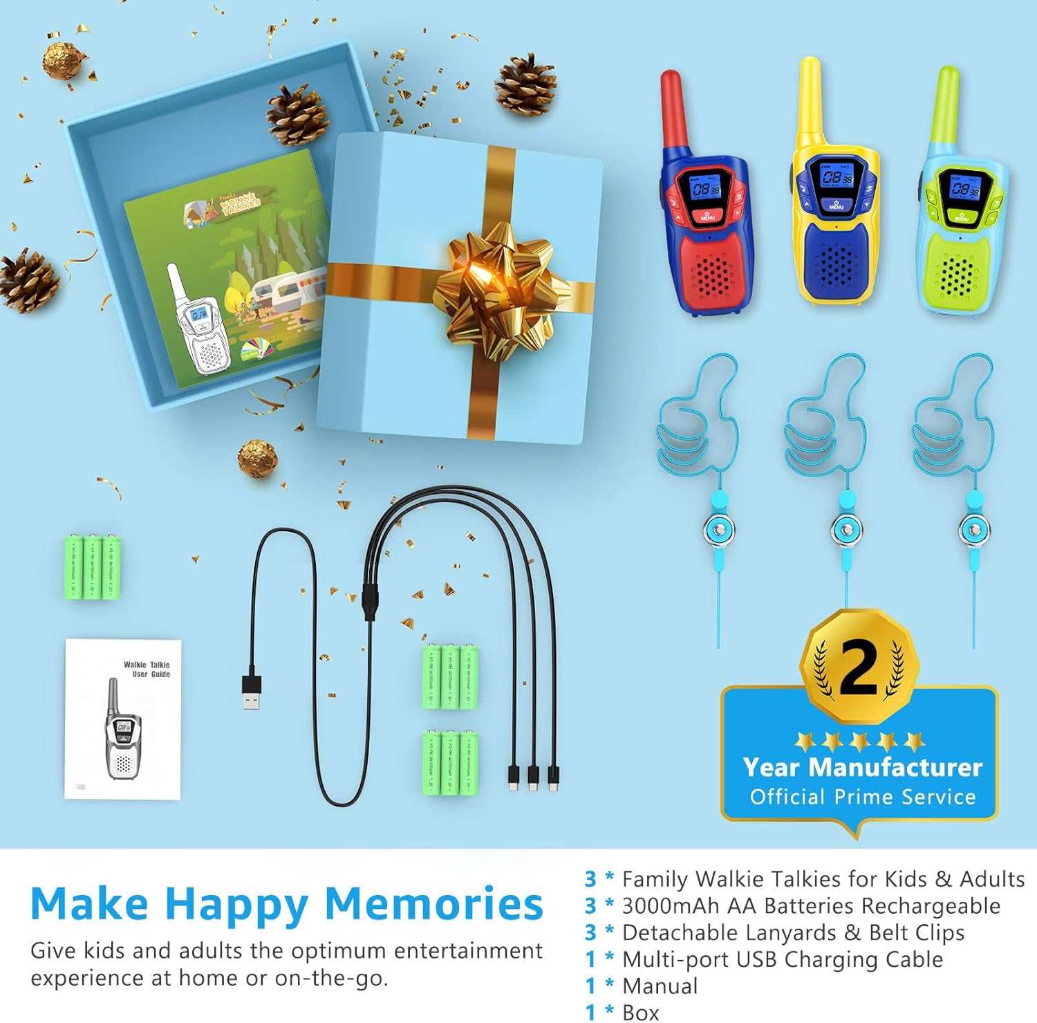 - Included Components : 1 * Manual & 3 Year Manufacturer Service, 1 * Multi-port USB Charging Cable, 3 * 3000mAh AA Batteries Rechargeable, 3 * Detachable Lanyards & Belt Clips, 3 * Family Walkie Talkies for Kids & Adults 1 * Manual & 3 Year Manufacturer Service, 1 * Multi-port USB Charging Cable, 3 * 3000mAh AA Batteries Rechargeable, 3 * Detachable Lanyards & Belt Clips, 3 * Family Walkie Talkies for Kids & Adults