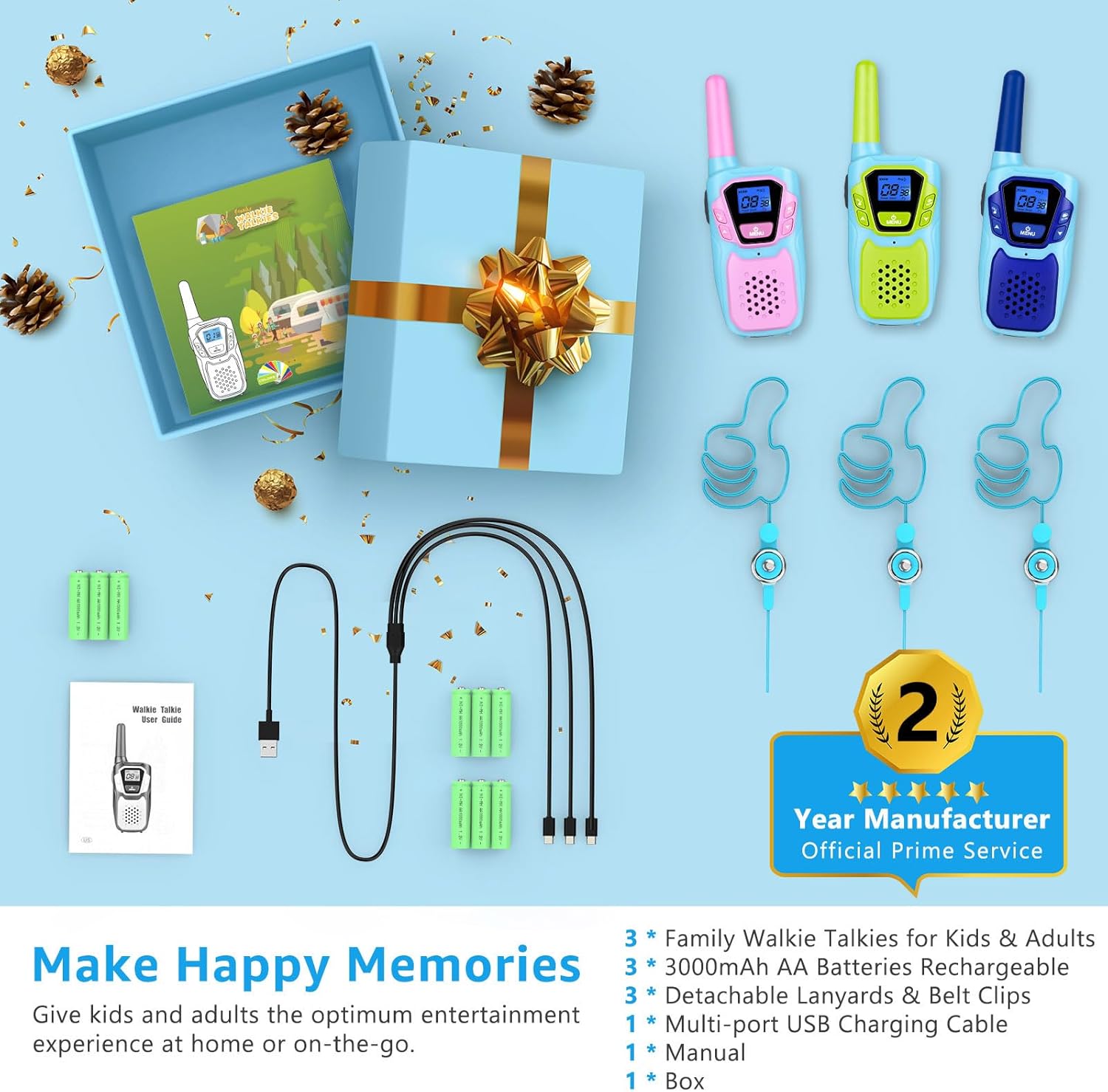 - Included Components : 1 * Manual & 3 Year Manufacturer Service, 1 * Multi-port USB Charging Cable, 3 * 3000mAh AA Batteries Rechargeable, 3 * Detachable Lanyards & Belt Clips, 3 * Family Walkie Talkies for Kids & Adults 1 * Manual & 3 Year Manufacturer Service, 1 * Multi-port USB Charging Cable, 3 * 3000mAh AA Batteries Rechargeable, 3 * Detachable Lanyards & Belt Clips, 3 * Family Walkie Talkies for Kids & Adults