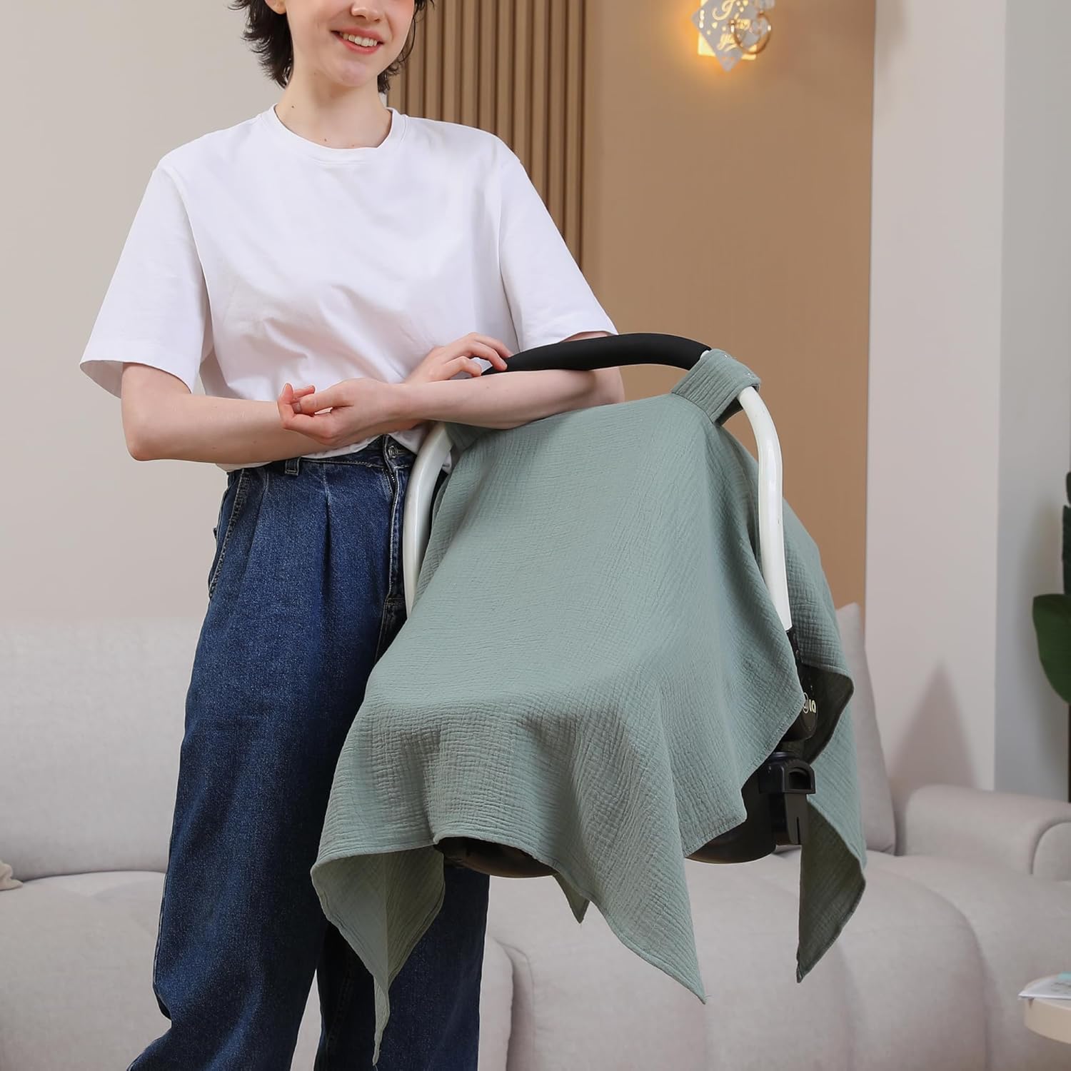 100% Muslin Cotton Car Seat Cover Baby, Carseat Canopy Cover, Universal Fit Stroller Covers for Boys and Girls (Roman Green)