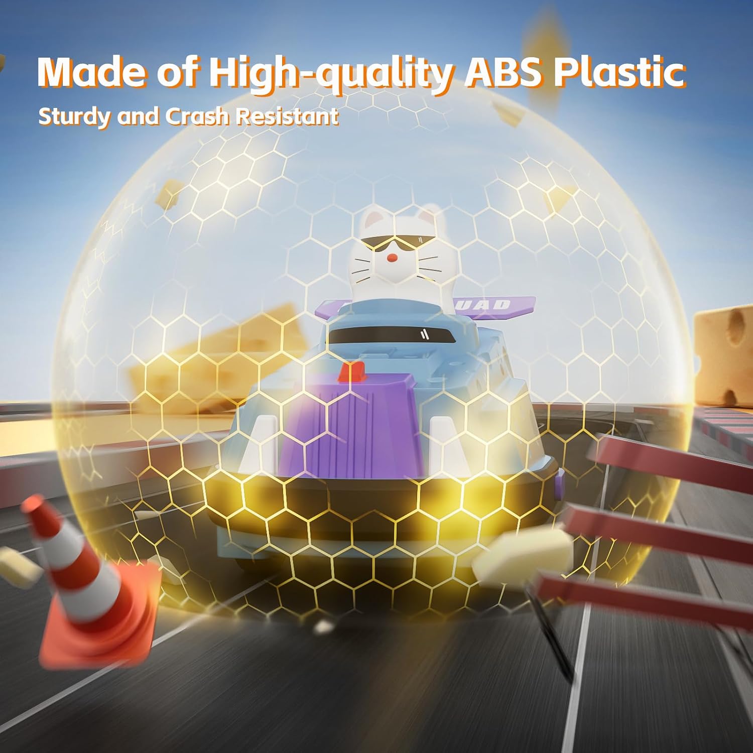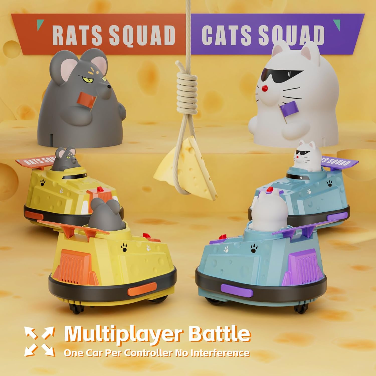 - 【Perfect Gifts for Kids & Adults】Our 2-pack of remote control bumper cars is the perfect gift for birthdays, holidays, Children's Day, Christmas, and New Year celebrations. Featuring a novel collision play style infused with a fun cat-and-mouse cheese theme, it delights children aged 6 and up, as well as adults.