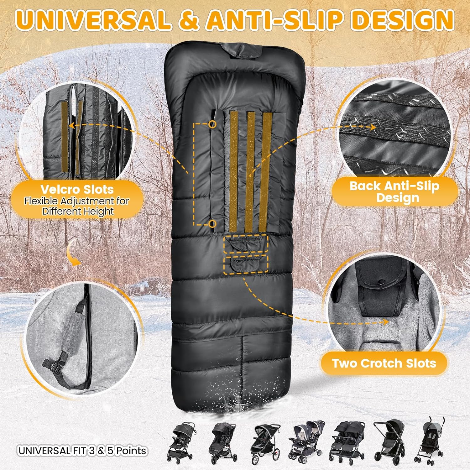 - Adjustable Fit & Anti-Slip: Secures to most strollers via Hook & Loop slots + non-slip textured backing. Reflective strips enhance visibility. 11.81" extended footmuff accommodates toddlers up to 3T/4T/5T (approx. 3-5 yrs)