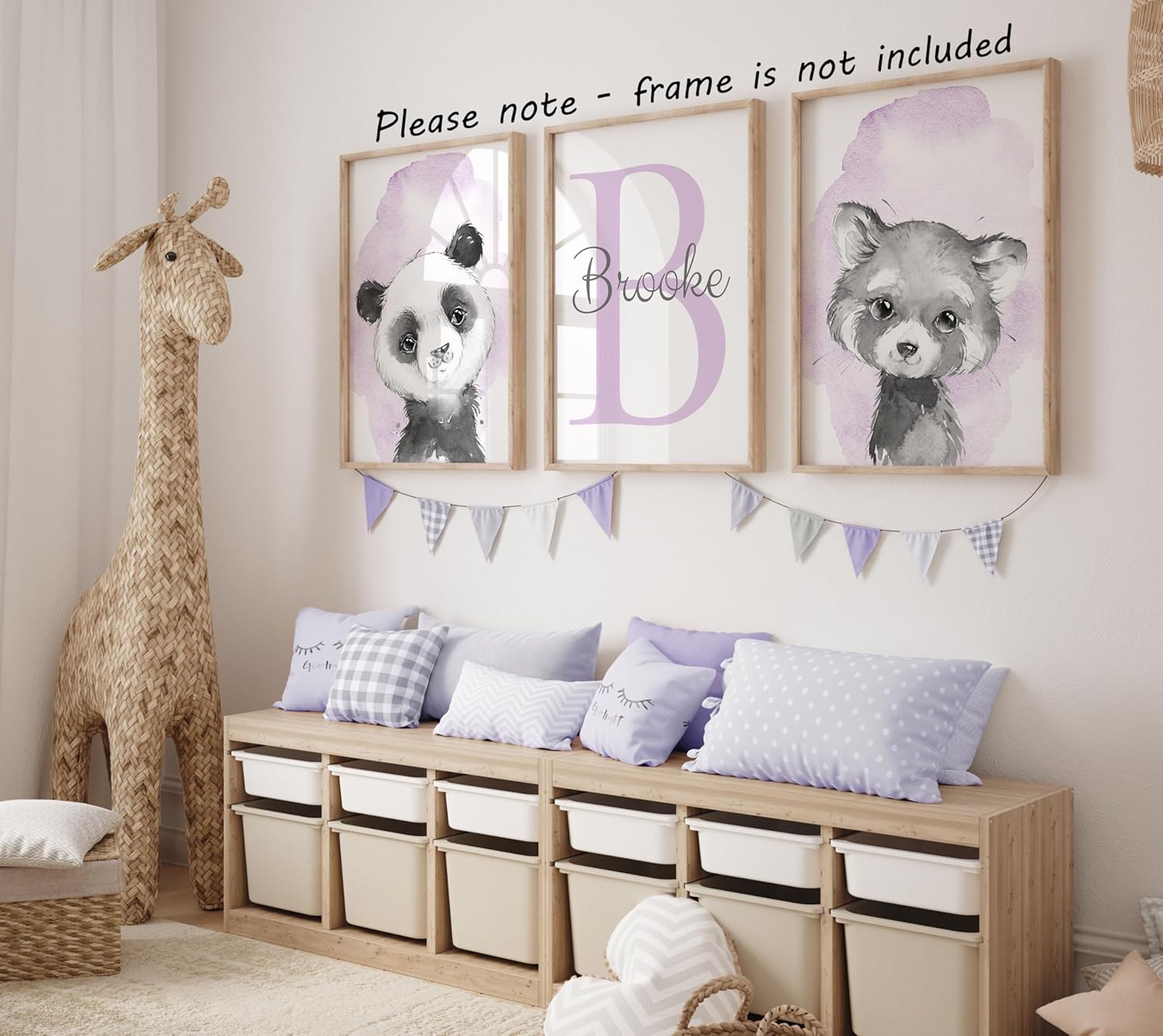 Safari Animals Set of 3 Unframed Poster Prints for Baby Girls Nursery Bedroom Playroom, Personalized Name, Choice of 12 Animals, Pink Purple (9x12)