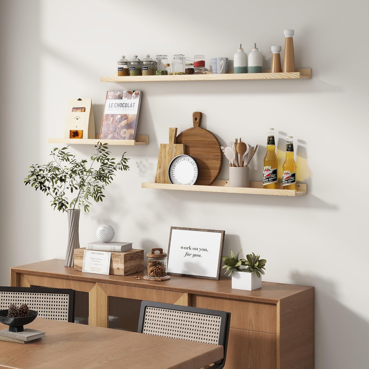 Pine Wood Nursery Book Shelves 3 Pack, Floating Ledge Shelves for Kids' Room, Bedroom, Bathroom, Long Floating Shelves for Wall, Natural