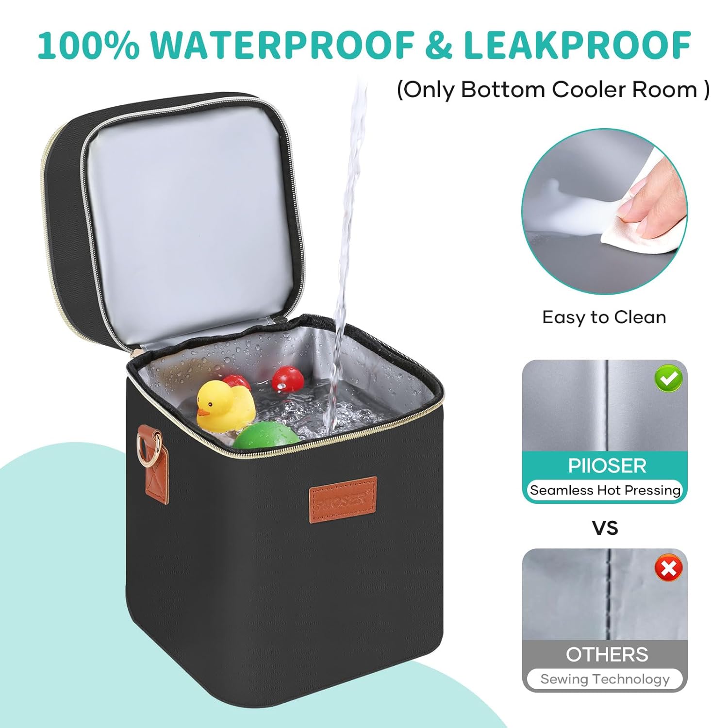PIIOSER Baby Bottle Tote Bag with Ice Pack, Fits 4 Baby Bottles Up to 9 Ounce, Small Insulated Breastmilk Cooler Travel Bag with Shoulder Strap for Nursing & Working Mom Daycare (Black-S)