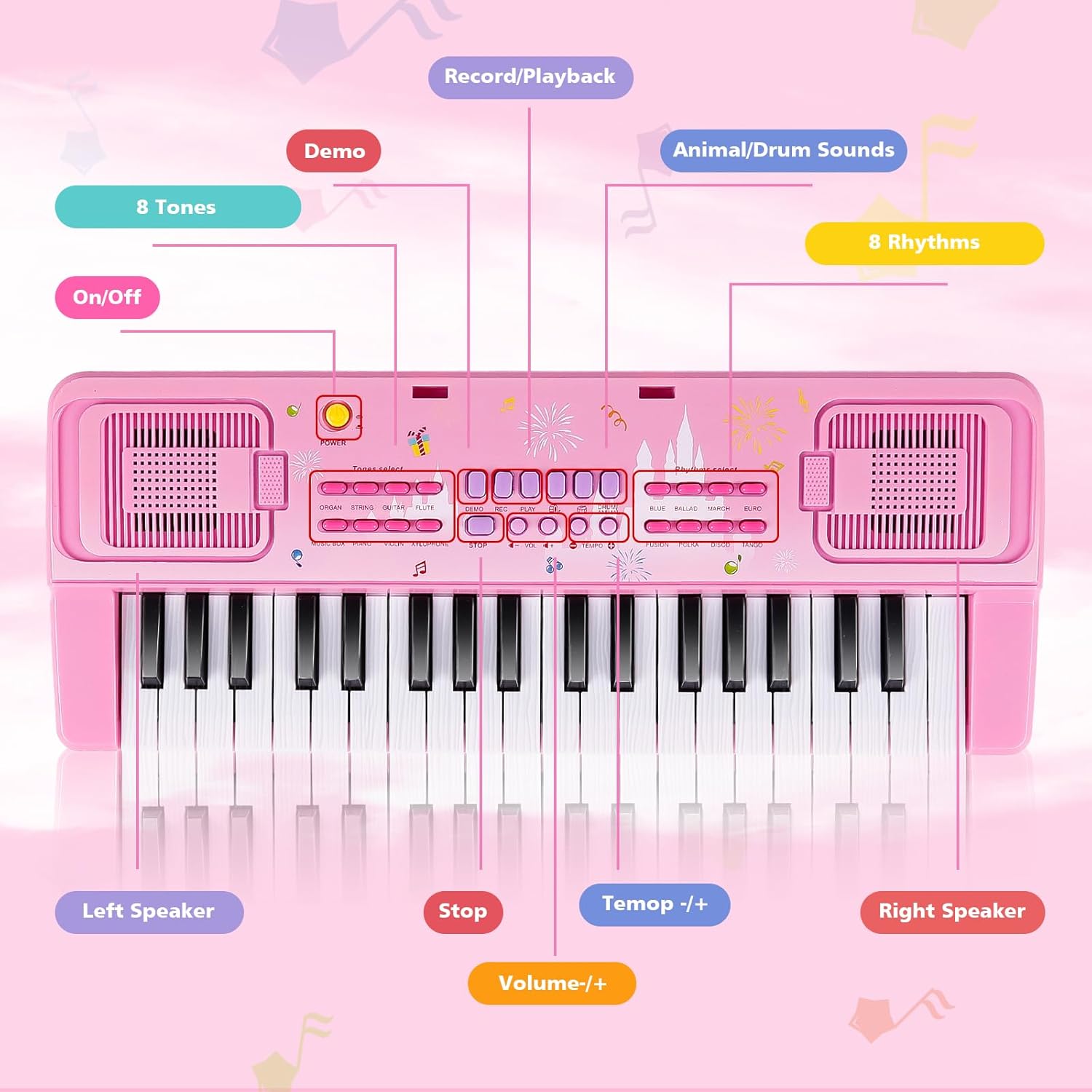 Kids Keyboard Piano, 37 Keys Keyboard Electric Digital Piano, Early Learning Educational Musical Toys Piano for Kids Toddlers Beginners with Music Stand, Microphone - Christmas Birthday Gifts, Pink