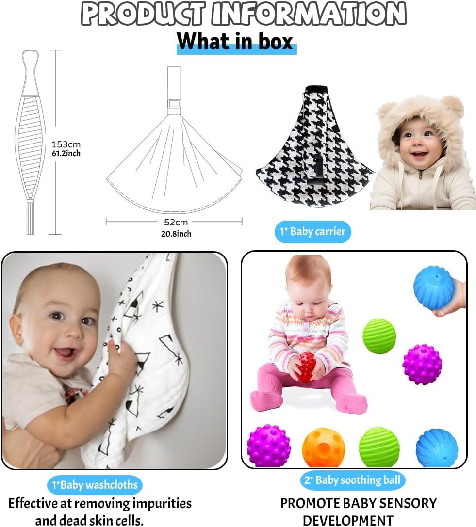 - 【What you get】 : 2 pcs different colors and shapes of toddler sensory ball, there are a variety of ways to play, colorful, more can attract the attention of the baby, 1pcs Baby Muslin Washcloths for Unisex 100% Cotton ,1pcs Convenient travel Baby Sling. is the holiday, Birthday, Thanksgiving and New Year's Christmas gift for your family and friends. Warning: This product is intended to be used with an adult for feeding and/or relaxation under direct adult supervision.