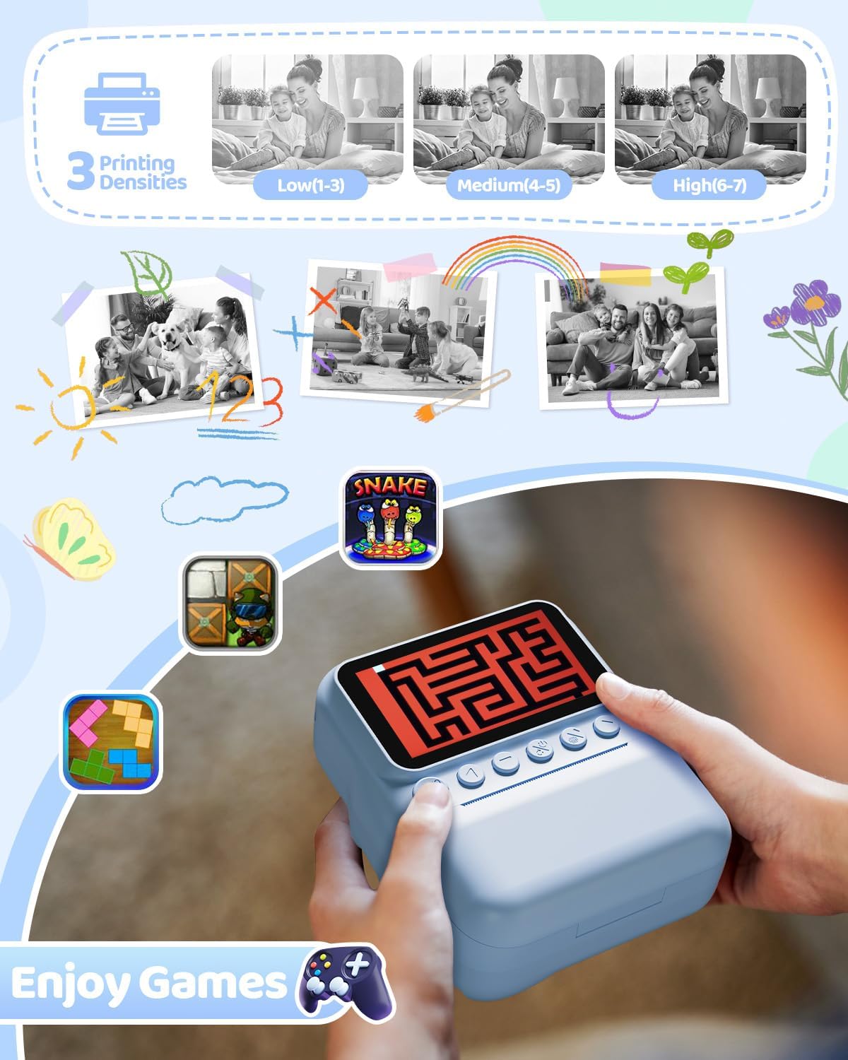 - MULTI-FUNCTIONAL INSTANT CAMERA: Our kids print camera has various functions such as photography, video, black and white printing, fun frames, music, games, flashlight and more. It can meet the different needs of children's entertainment and bring happiness to children.
