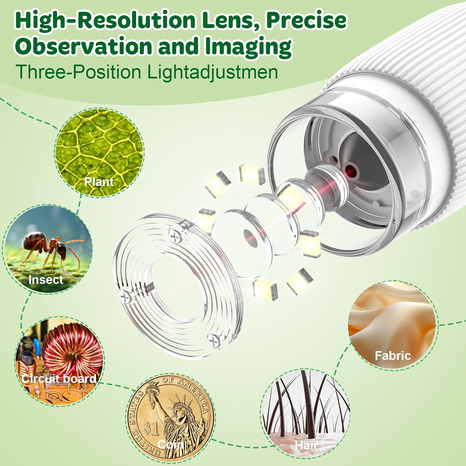 - HD Viewing Screen: The 2-inch HD screen delivers vibrant colors and sharp details. With precise fine and coarse focus adjustments, children can easily and clearly explore the microscopic world, providing a richer and more intuitive viewing experience.