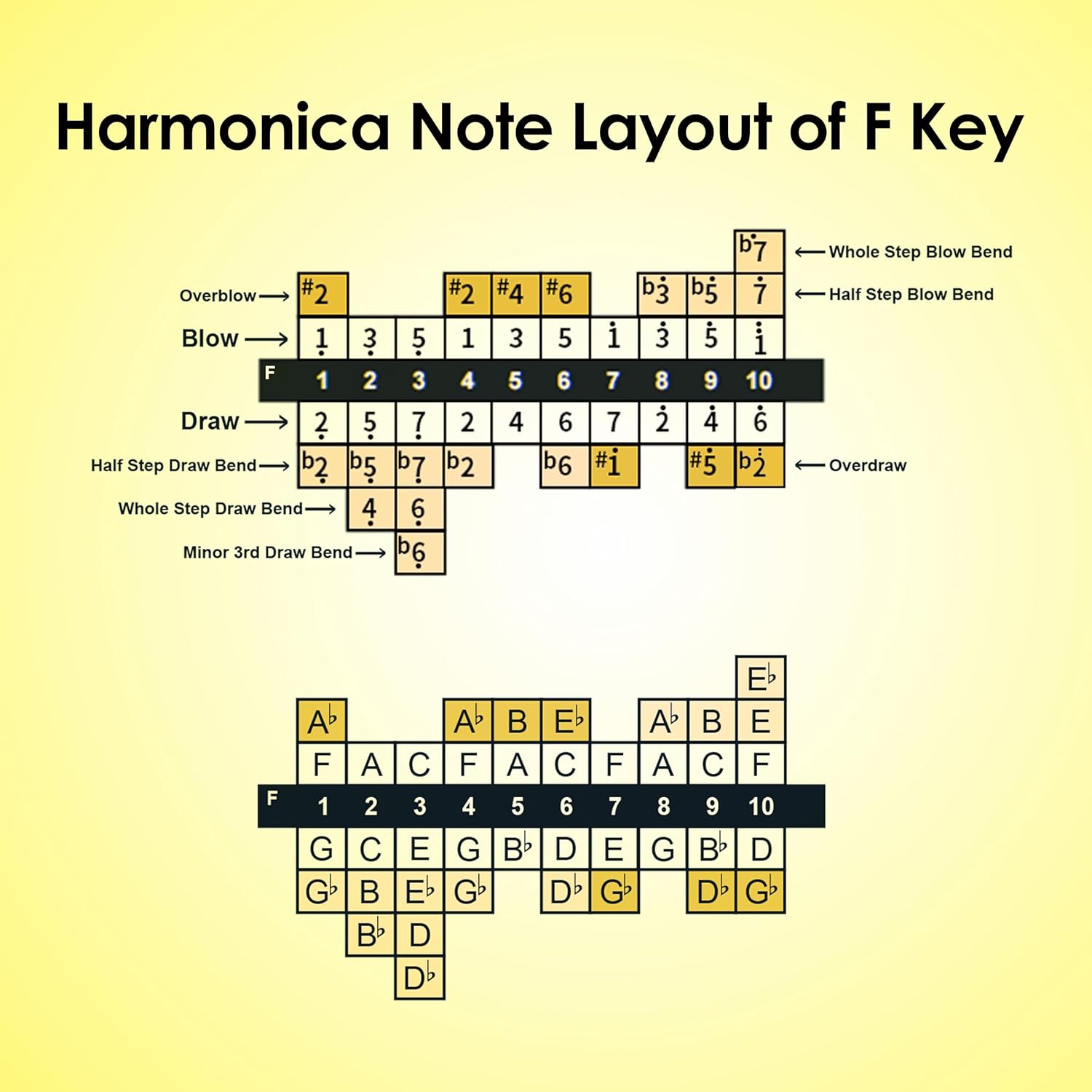 - 10 Holes Diatonic Harmonica: which features 10 holes with reeds tuned to the key of F. It's allowed to play a complete 7-note scale of the key.With advanced playing techniques, you can produce additional notes from outside the scale, adding depth and versatility to your music