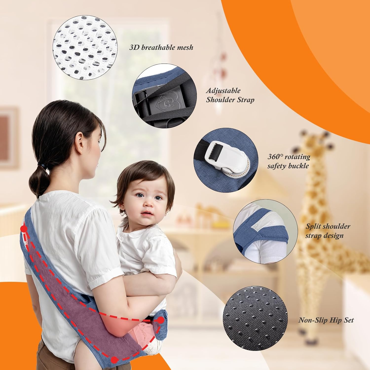 - 360°Safety and Double Protection:Equipped with a 6cm mountaineering-grade 360° rotating safety buckle and made of 600D high-density Oxford cloth, this baby carrier sling is slip-resistant and extra durable. The 10cm anti-slip safety rope provides additional protection, ensuring your child’s safety, making it an ideal toddler hip carrier for both everyday and outdoor use.