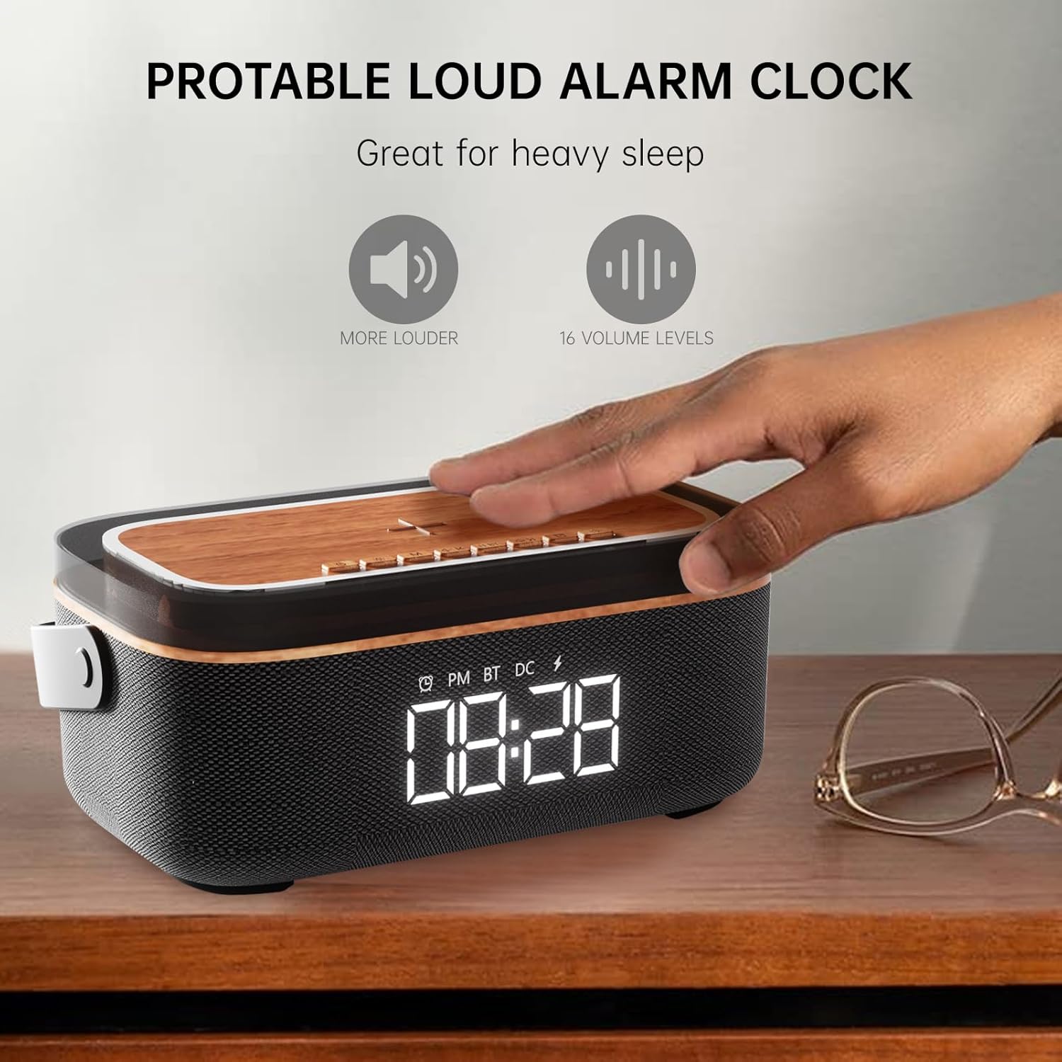 LOVME Alarm Clock Bluetooth Speaker for Bedroom, Bluetooth Stereo Sound Speaker, Fast 15W Wireless Charger, Dimmer, Night Light for Heavy Sleepers, Gift Set, Bedside(Black)