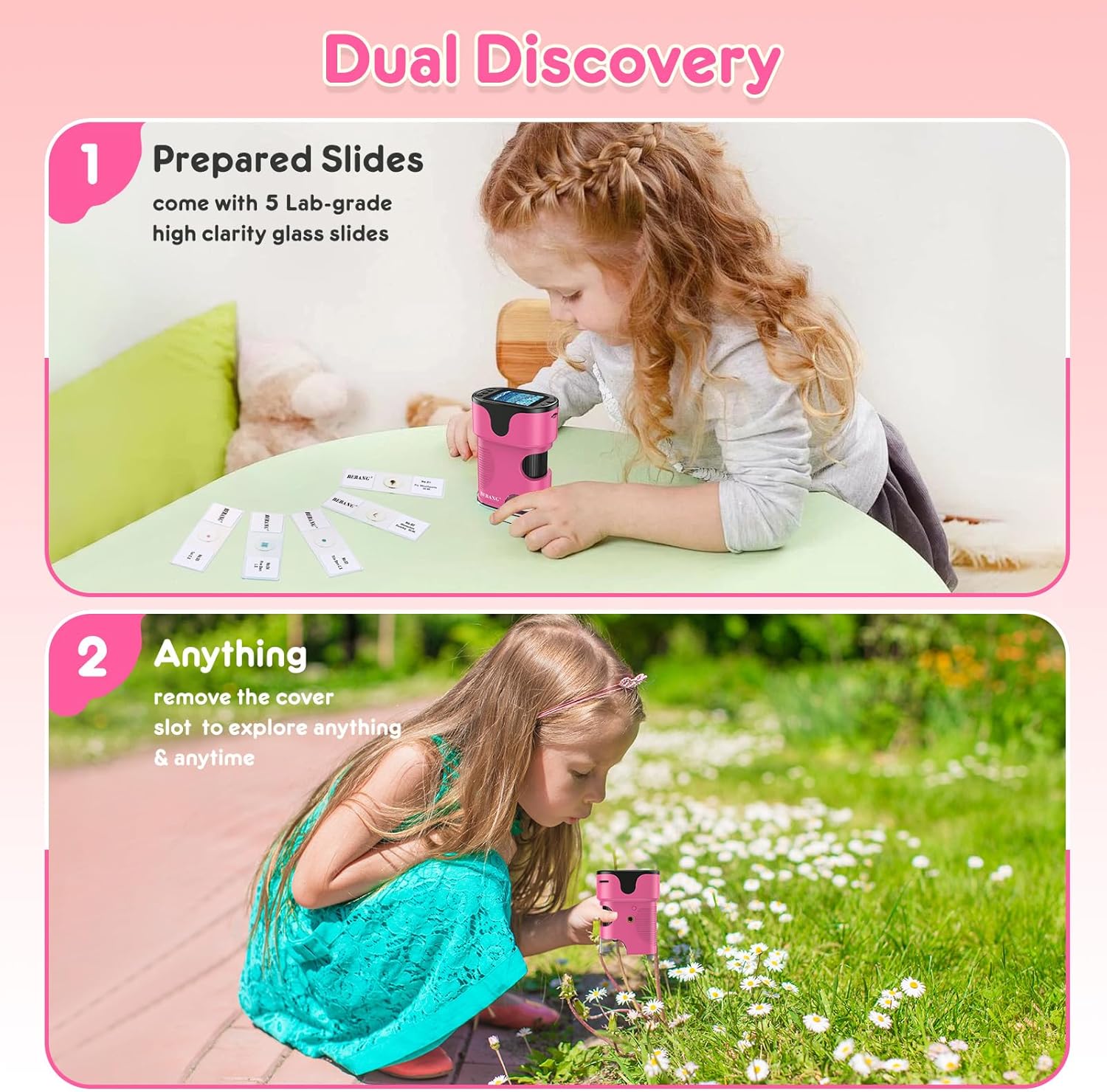 1000X Handheld Microscope for Kids 4K 2.0" Screen Rechargeable Mini Pocket Digital Microscopes w/Slides Kit Portable Edu Gift Age 4-6 8-12 Children Students (Pink)