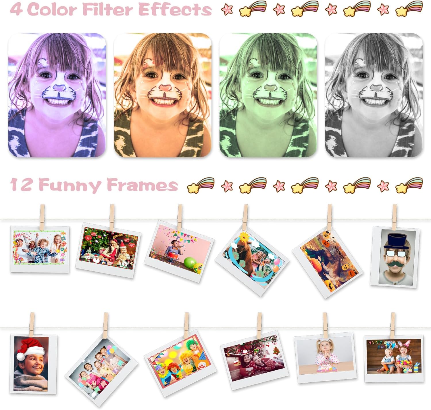 - [ 12 Funny Frames and 4 Filters ] - The cameras built-in 12 fun frames and 4 filter effects allow children to choose freely to add creativity and fun to photos. It will encourage children to use their imagination to create personalized photos through different frames and filters. The camera for kids has a front lens for selfie, they also can set the time-lapse for shooting.