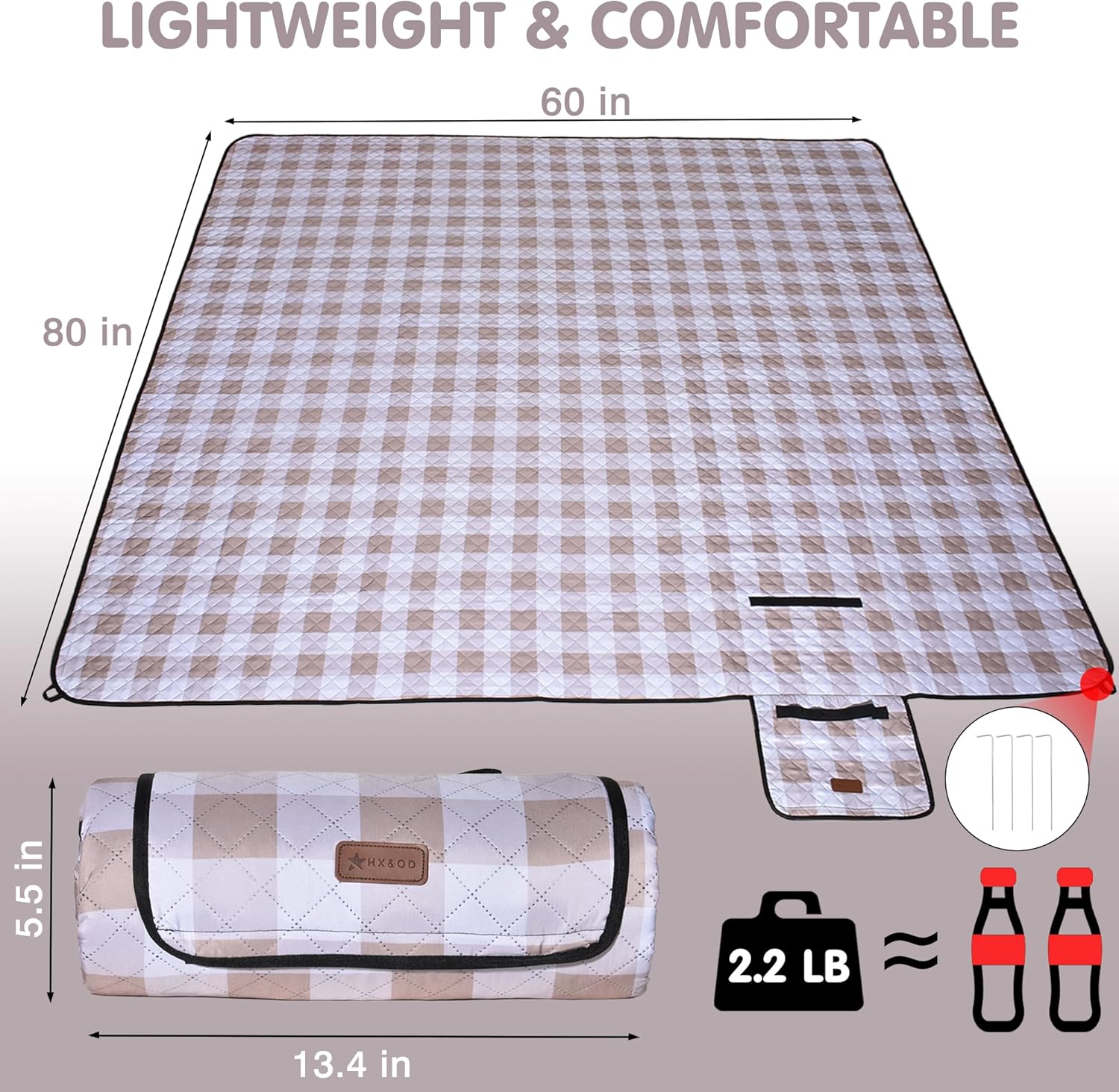 HX&OD Outdoor Picnic Blanket, Extra Large, 80''x60'' Waterproof Foldable Blankets Gingham Picnic Mat for Beach, Camping Grass Lawn Park Accessories Cute Couple Ideas Wedding (Light Brown, 80”x60”)