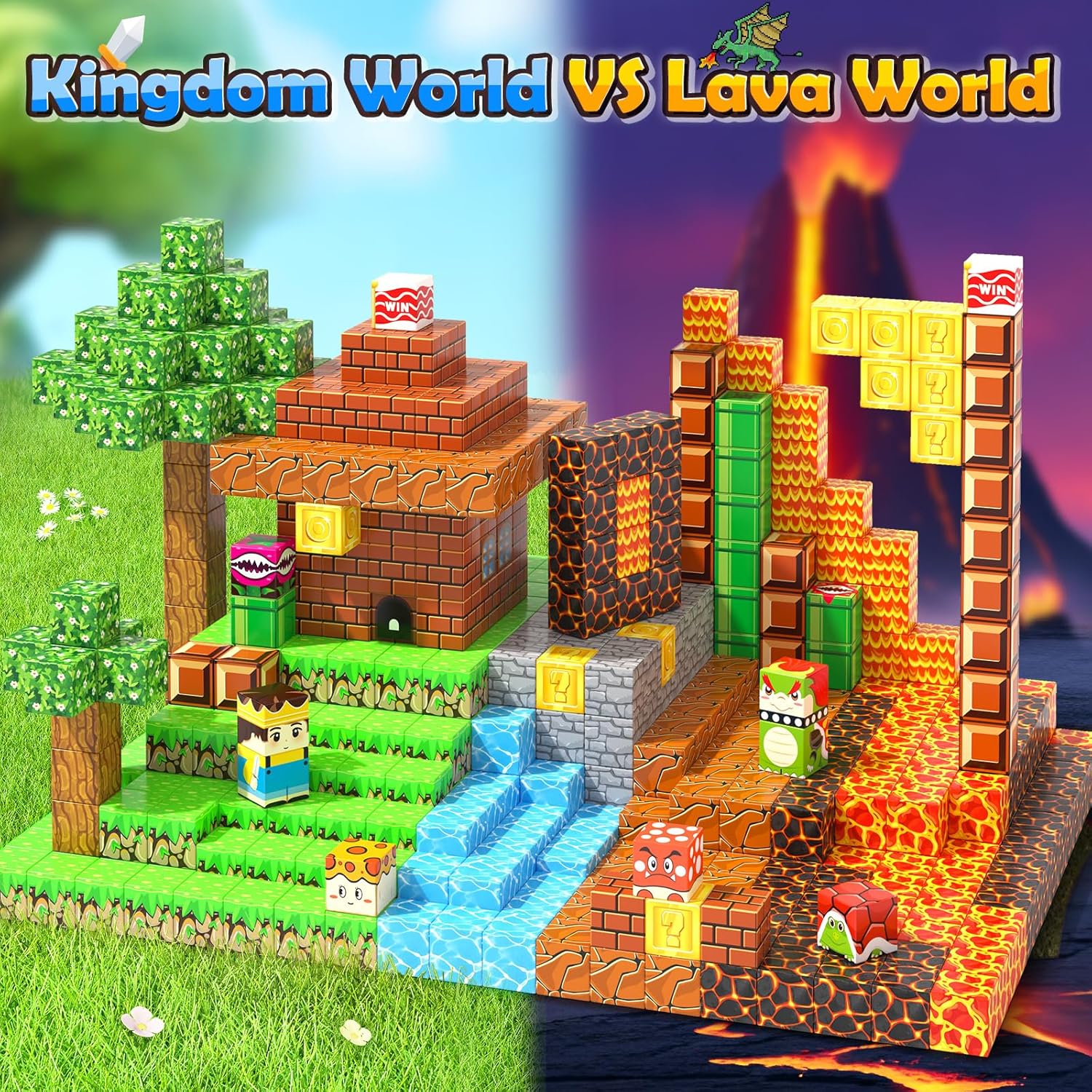 - 100PCS MAGNETIC BLOCKS ADVENTURE SET: The magnetic blocks set is perfect for kids who love the game. These magnetic building blocks are easy to assemble and not easy to collapse like other normal building toys, attracting curiosity, and boosting confidence. The magnet toy includes various game elements like grass, blocks, coin blocks, ? blocks, lava, water...suitable for designing levels, developing creativity and ideal for STEM learning and enhancing fine motor skills
