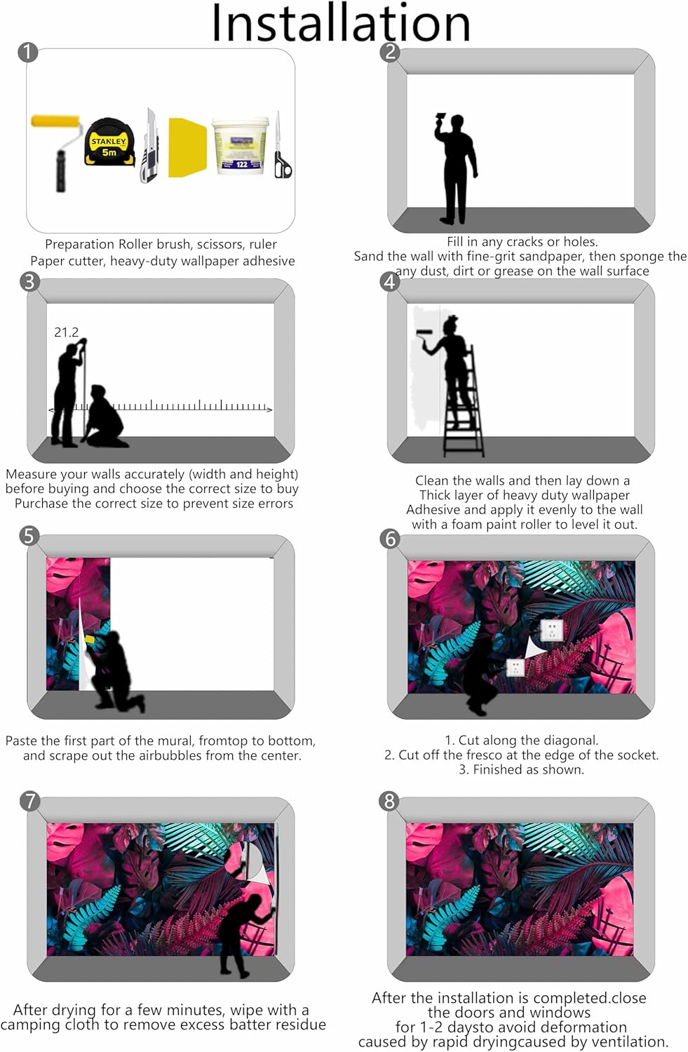 - Installation Steps1. Fill in any cracks or holes and clean the surface of the wall of dust, dirt and grease.2. Apply heavy-duty wallpaper paste to the wall, not the mural.3. Mark the position of each strip of wallpaper with a spirit level.4. Align the pattern and slide it into place.5. Scrape the bubbles with a spatula.6. Let it dry for a couple of minutes and it's ready to go!
