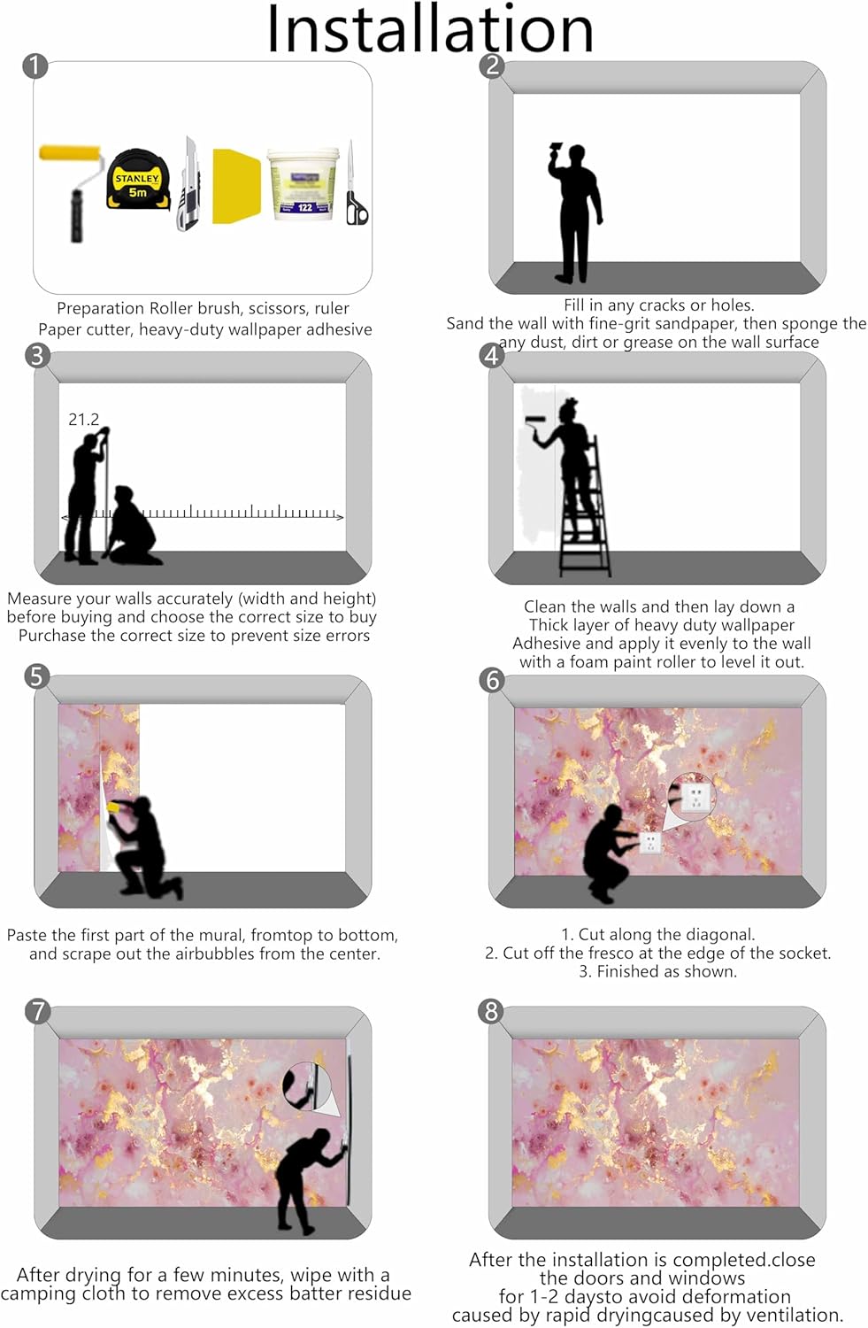- Installation Steps1. Fill in any cracks or holes and clean the surface of the wall of dust, dirt and grease.2. Apply heavy-duty wallpaper paste to the wall, not the mural.3. Mark the position of each strip of wallpaper with a spirit level.4. Align the pattern and slide it into place.5. Scrape the bubbles with a spatula.6. Let it dry for a couple of minutes and it's ready to go!