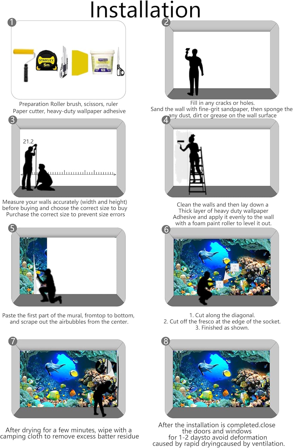 - Installation Steps1. Fill in any cracks or holes and clean the surface of the wall of dust, dirt and grease.2. Apply heavy-duty wallpaper paste to the wall, not the mural.3. Mark the position of each strip of wallpaper with a spirit level.4. Align the pattern and slide it into place.5. Scrape the bubbles with a spatula.6. Let it dry for a couple of minutes and it's ready to go!