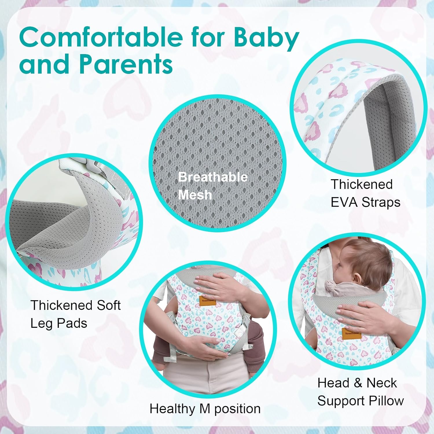 - Comfortable & Safe: This newborn carrier is made of high quality polyester fiber, soft and durable, the scientific carrier structure places baby's legs in the ergonomic natural "M” position to ensure the healthy development of baby's hips and spine.Soft legs protective pads and head support pads suitable for toddlers 1-3