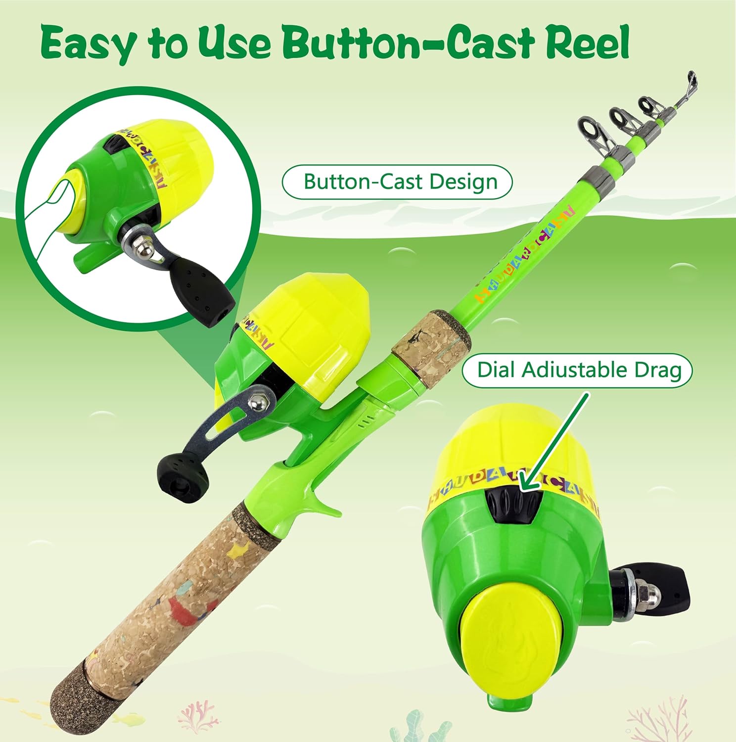 - 🐟【Portable and Convenient to Carry】Child fishing pole set are collapsible which make it portable enough to carry along with you conveniently. We also offere a carry bag which you can put all the fishing accessorries in it. Kids can also take it out easily. Easily fits in car trunk, boat or backpack. Best gift for your families. Enjoy your families' fishing times with your lovly kids.