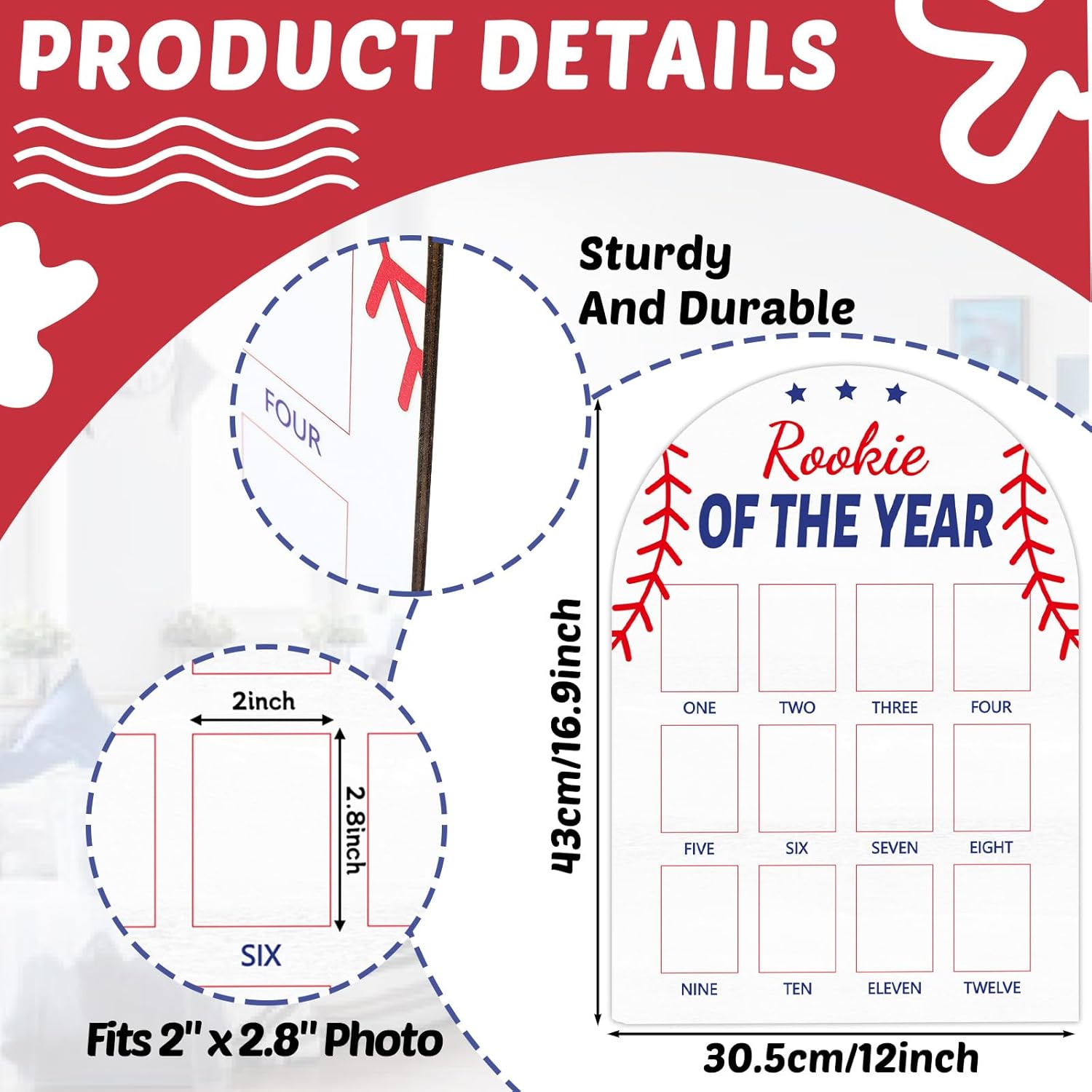 - Package Includes: This set includes 1pcs of rookie of the year photo board, measuring 16.9 x 12 x 0.2 inches, suitable for 2 x 2.8 inches photos. Designed to be a keepsake, this baseball 1st birthday wooden board holds 12 monthly photos, celebrating your baby's growth and special milestones throughout their first year.