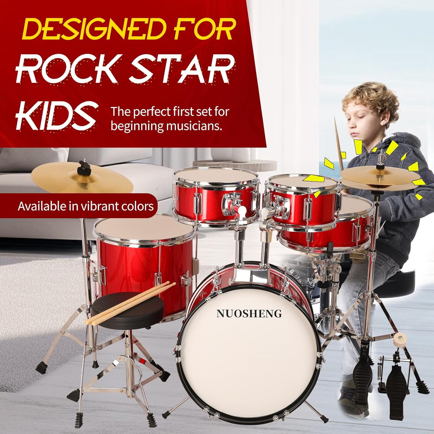Kids 5-Piece Complete Junior Drum Set with Genuine Brass Cymbals with 16" Bass Drum, Tom-Tom, Snare, Cymbals, Hi-Tone Drum, Drum Sticks, Base Pedal and Adjustable Throne, Beginner Set Red