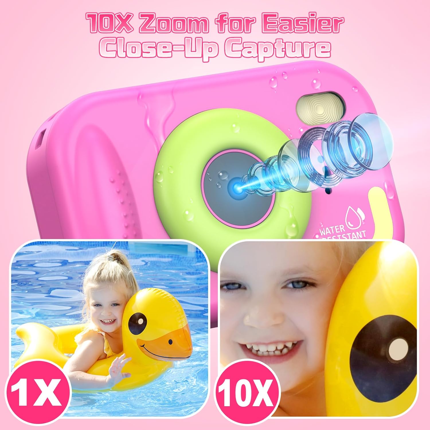 Kids Camera Waterproof, IP68 Underwater Camera for Kids Aged 3-12, HD Kids Digital Camera with 1080P Video Recording, Durable ABS Material, Pool Toys for Boys Girls with 32GB Card (Pink)