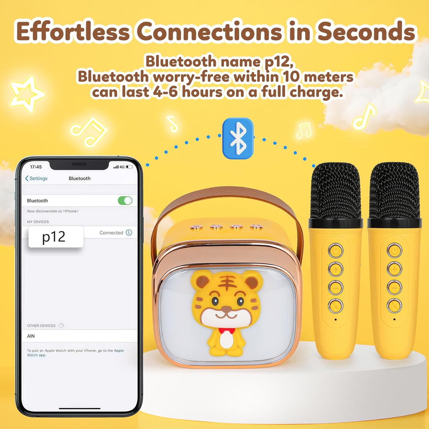 - MULTIFUNCTIONAL KARAOKE TECH: This wireless microphone with speaker is designed for children with colorful changing lights, tiger toys, and two mini karaoke microphones. Hassle-free connectivity with the new Bluetooth 5.4 technology (P12 quick-connect).