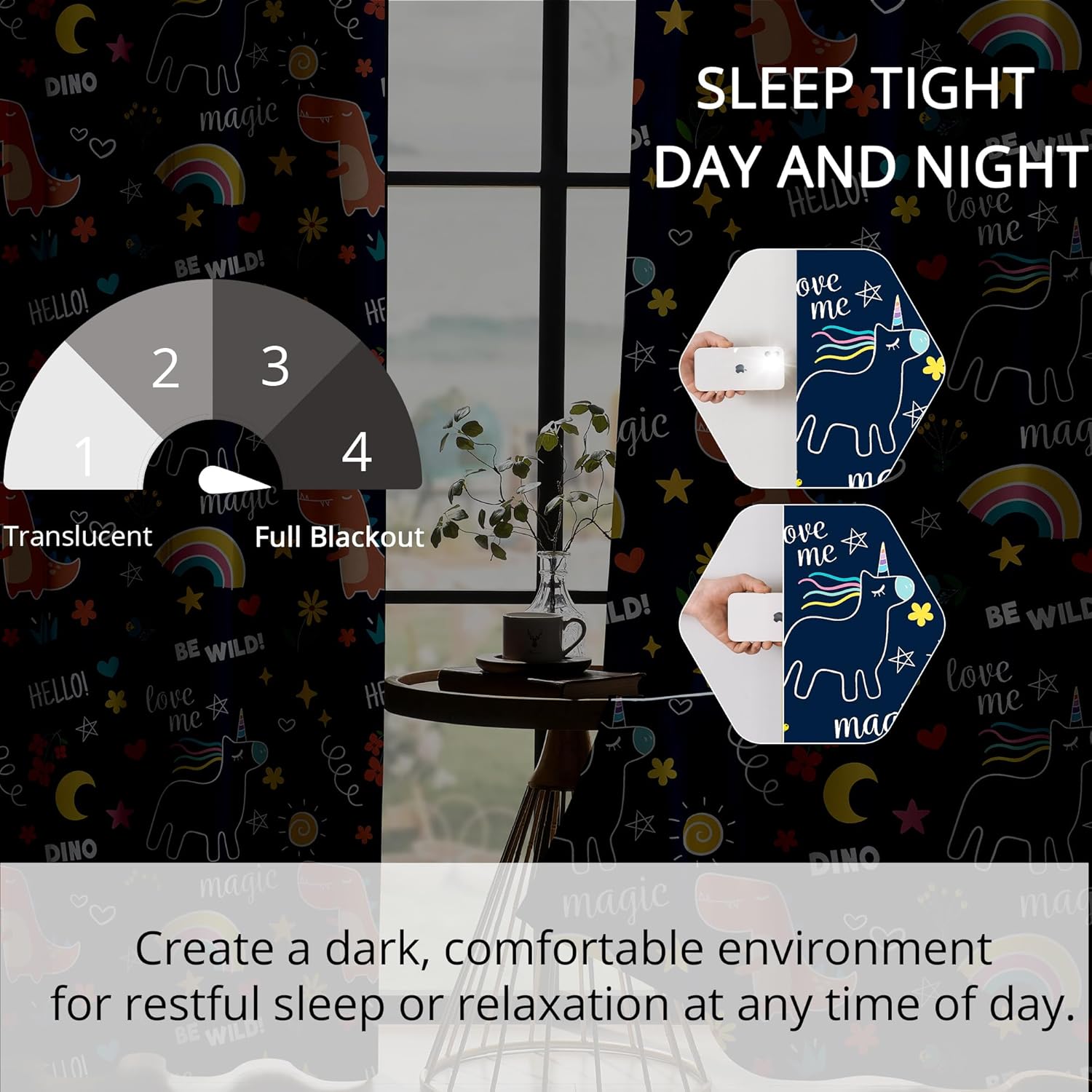 100% Blackout Curtains for Kids - Adorable Dinosaur & Unicorn Pattern, 2Panels, Each W52xL63, Thermal Insulated Noise-Reducing Drapes for Nursery, Bedroom, Playroom - Fun & Colorful Design