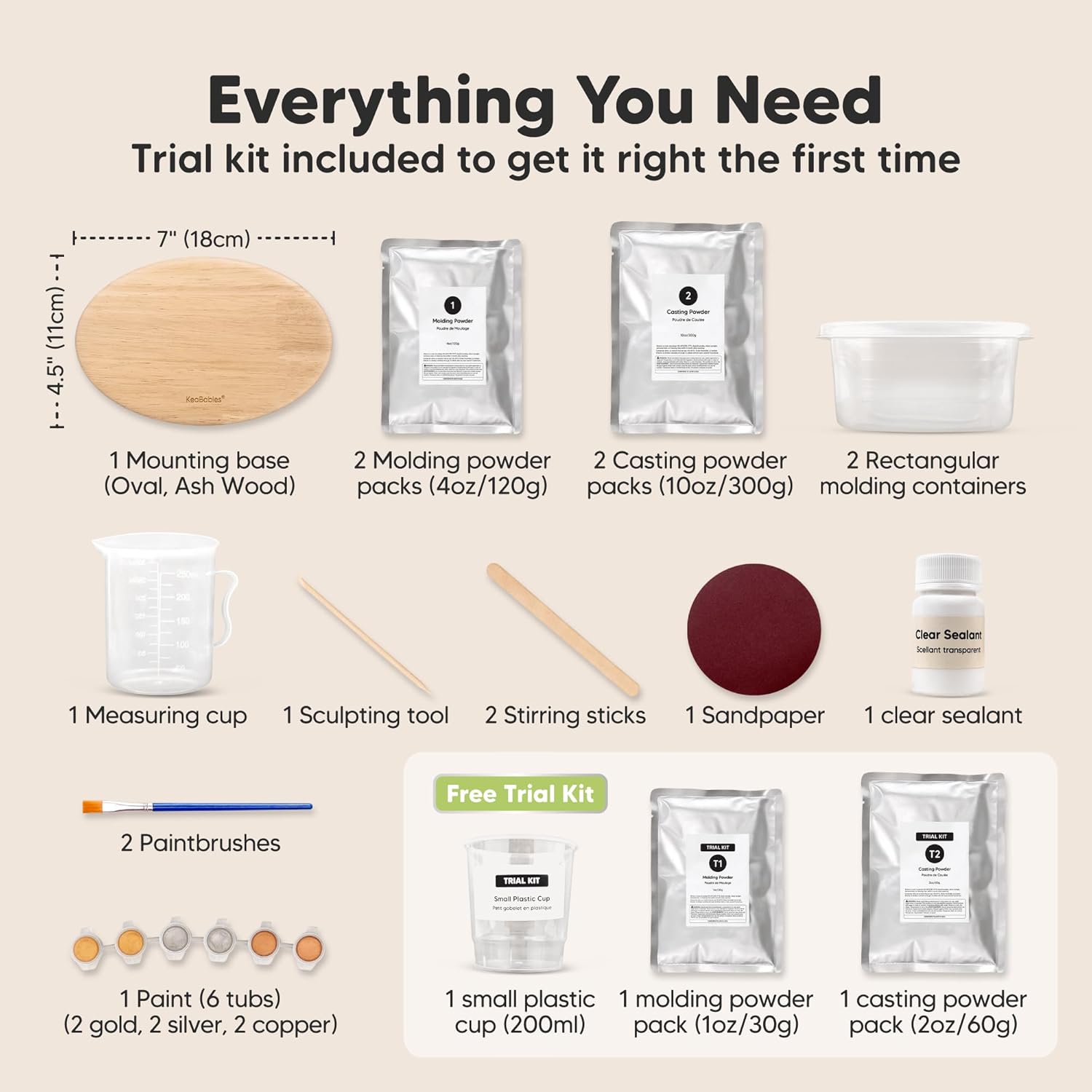 - All-in-1 – Our baby molding kit has all you need to personalized 2 castings. Includes a trial kit, 2 molding & casting powder pack, display base, sealant, 2 molding containers, stirring sticks, colored paint, brushes, sculpting tool, and sandpaper.