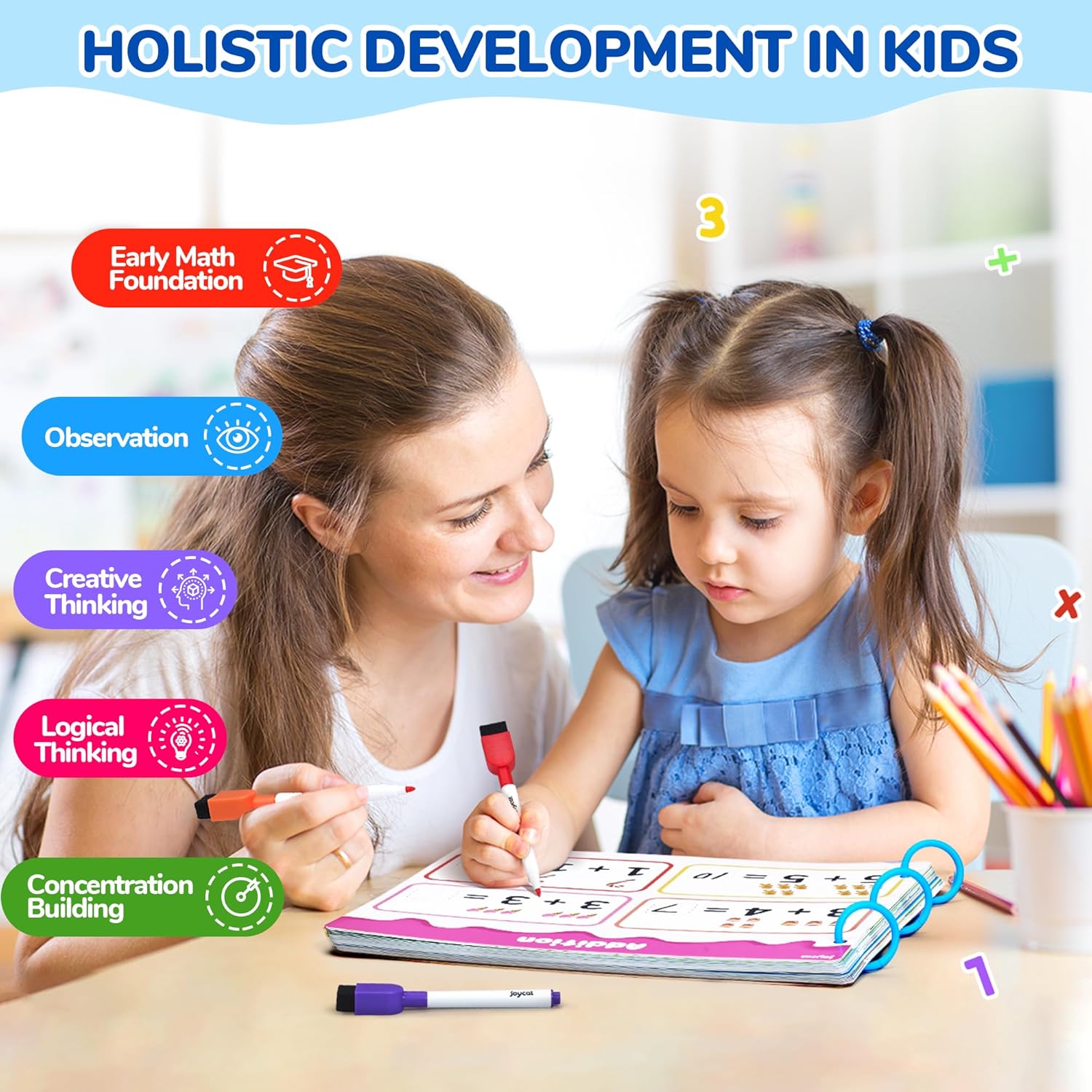 - What's Included: The JoyCat Math Game Book Set contains: 1 reusable math activity book (48 learning pages with 10+ math themes), 10 dry-erase markers, 1 cleaning cloth, and 1 storage bag for easy organization