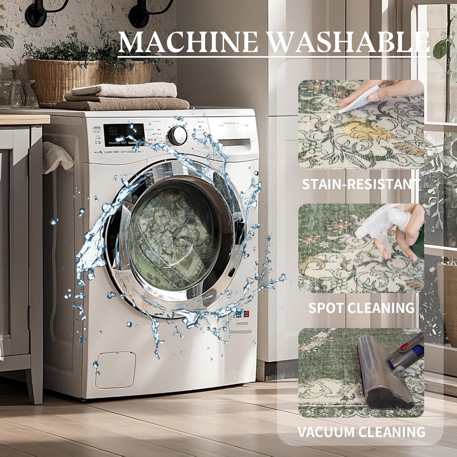 10x14 Area Rug Washable: Oriental Soft Area Rug for Living Room Bedroom No Shedding - Low Pile Thin Carpet Rug for Dining Room Non Slip - Boho Vintage Rug for Home Decor - Olive Green