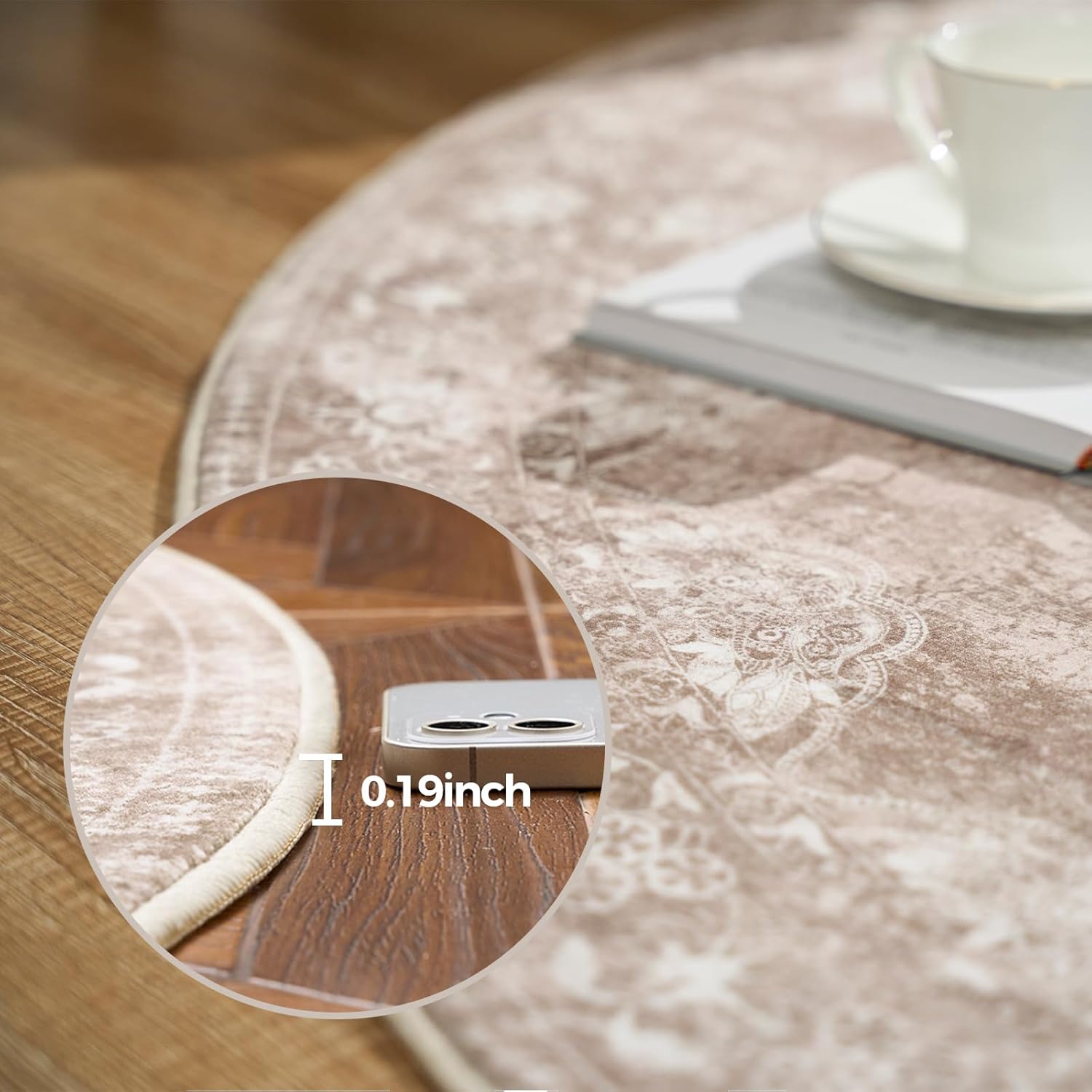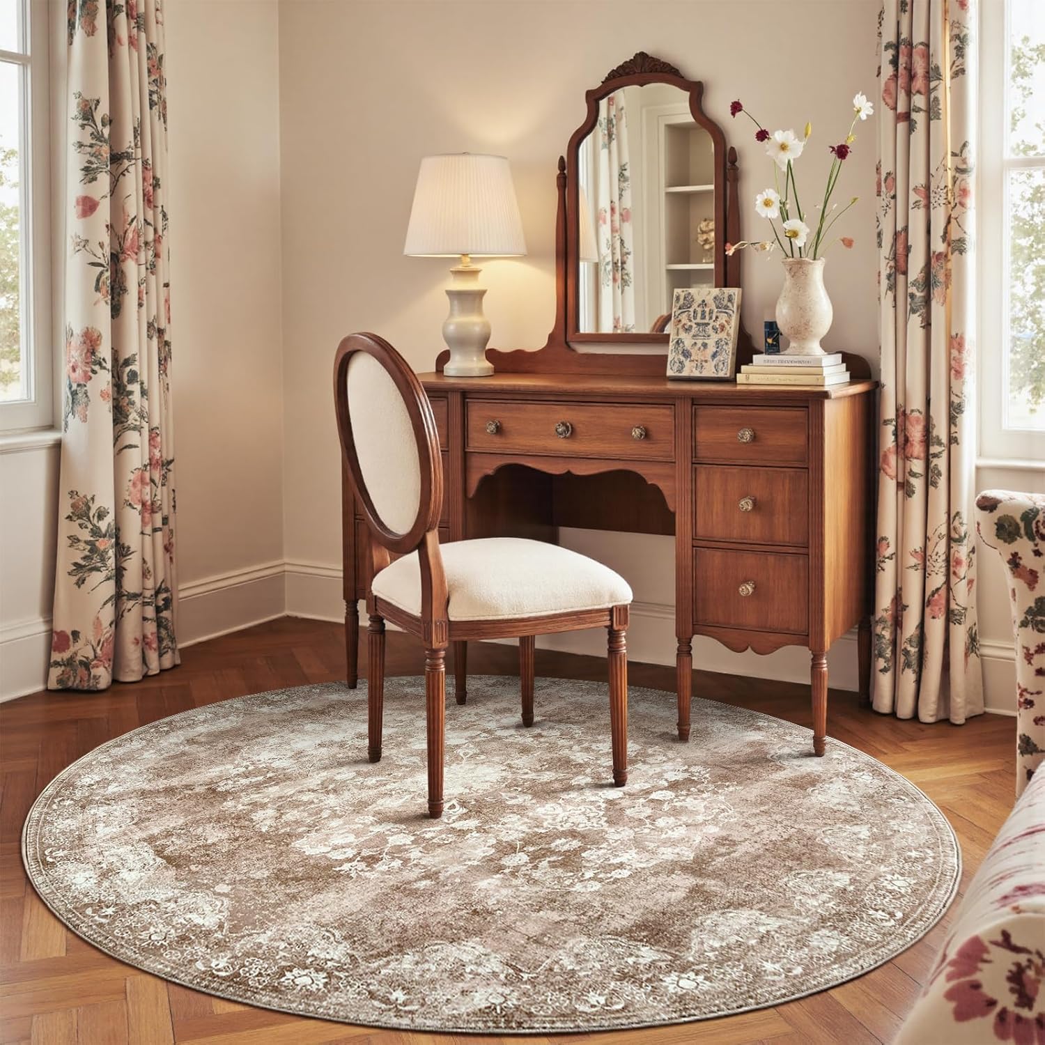 jinchan Round Rug 6ft Area Rug - Brown Vintage Floor Mat Kitchen Indoor - Washable Circle 6' Thin Floral Print Carpet Retro Farmhouse Non Slip Dining Room Living Room Bedroom Office