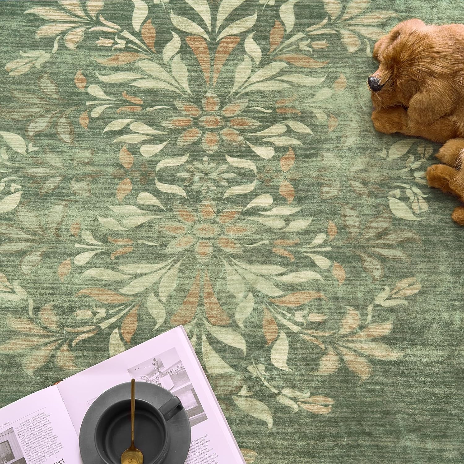 jinchan Round Rug 7ft Area Rugs,Vintage Floral Distressed Design Machine Washable Soft Non-Slip Low-Pile Ultra-Thin Circle Rug for Living Room Dining Room Bedroom Home Office (7' Round,Dark Green)