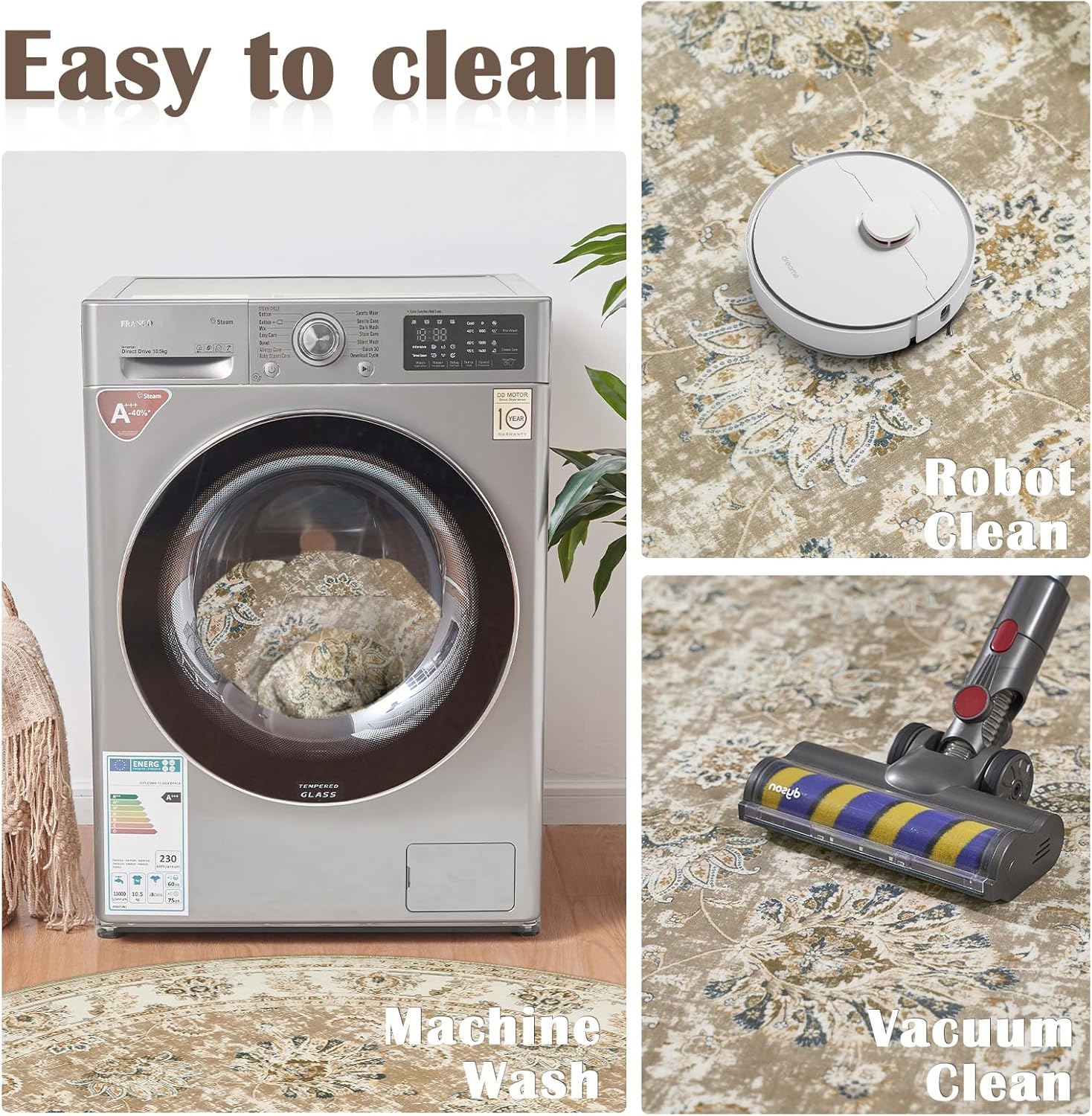 jinchan Round Rug 6ft Area Rug - Taupe Vintage Floor Mat Kitchen Indoor Ultra-Thin Soft Floral Print - Washable Circle 6' Retro Accent for Farmhouse Non Slip Dining Room Living Room Bedroom Office