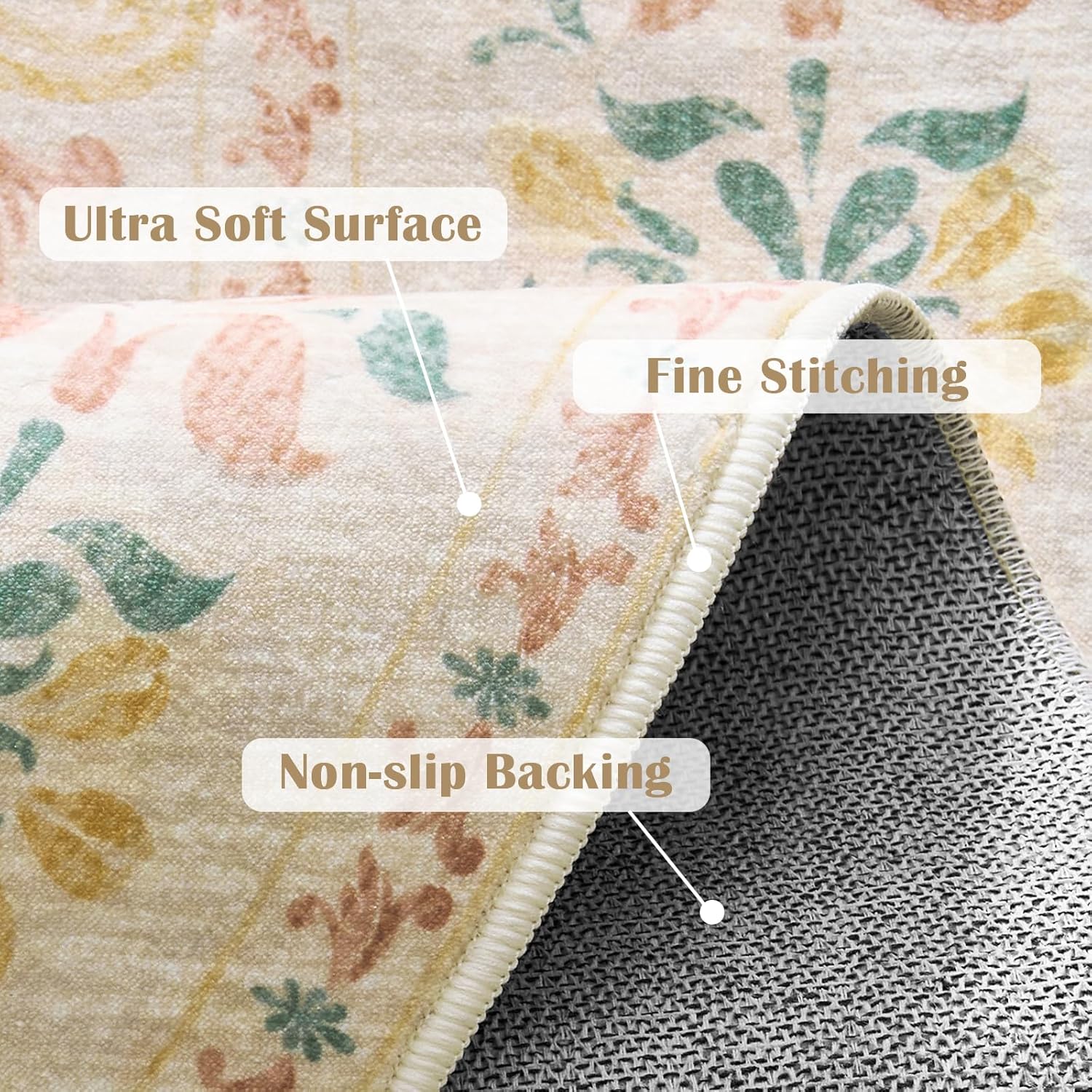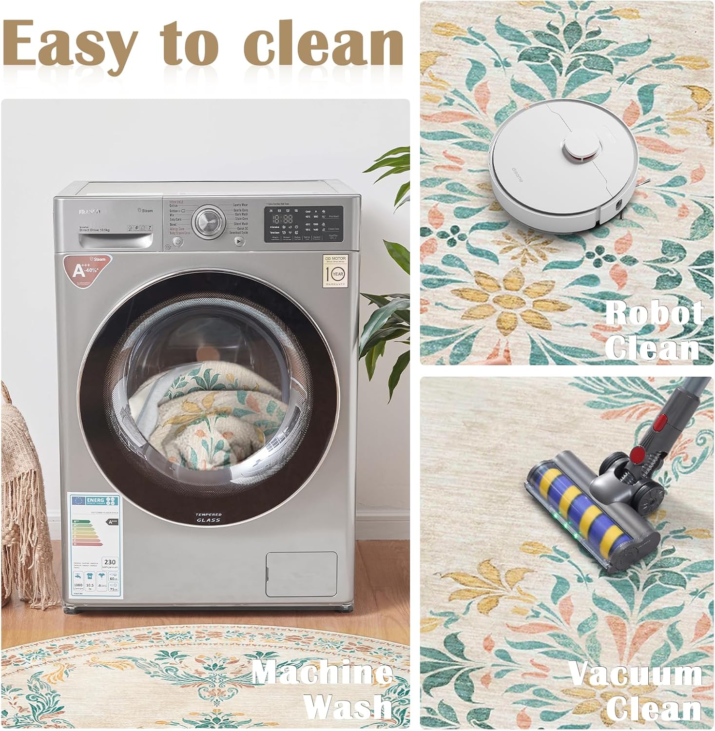 jinchan Round Rug 8ft Area Rugs,Vintage Floral Distressed Design Machine Washable Soft Non-Slip Low-Pile Ultra-Thin Circle Rug for Living Room Dining Room Bedroom Home Office (8' Round,Apricot Multi)