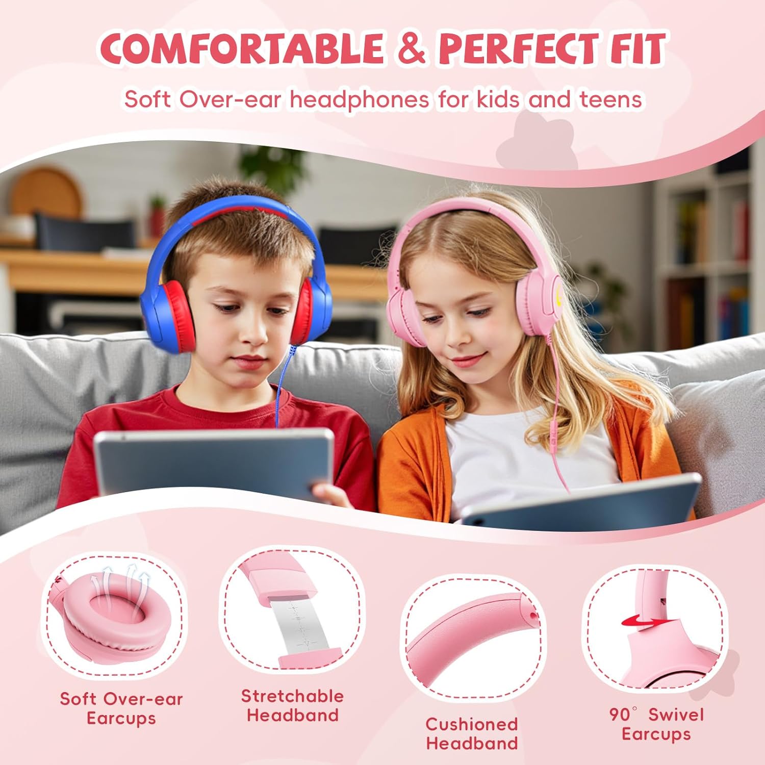 Kids Headphones with Microphone for School, 85/94 dB Volume Limit, Wired Over Ear Girls Headphones for Kids with Stereo Sound 3.5mm Wired Cord for Kindle Tablet Airplane Travel, Pink