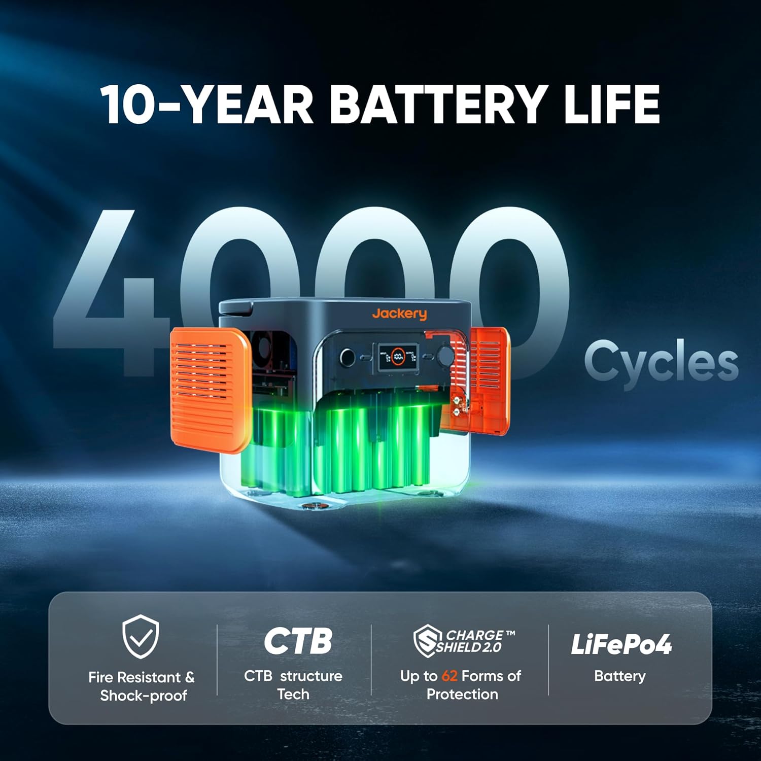 - Enhanced Durability & Safety. The Jackery Solar Generator 2000 v2 comes with an advanced temperature control system that minimizes fan noise for a quieter operation. Its durable LiFePo4 battery provides up to 10 years of performance, making it ideal for indoor use. It runs silently and produces no fumes, offering a clean, safe, and eco-friendly alternative to gas generators.