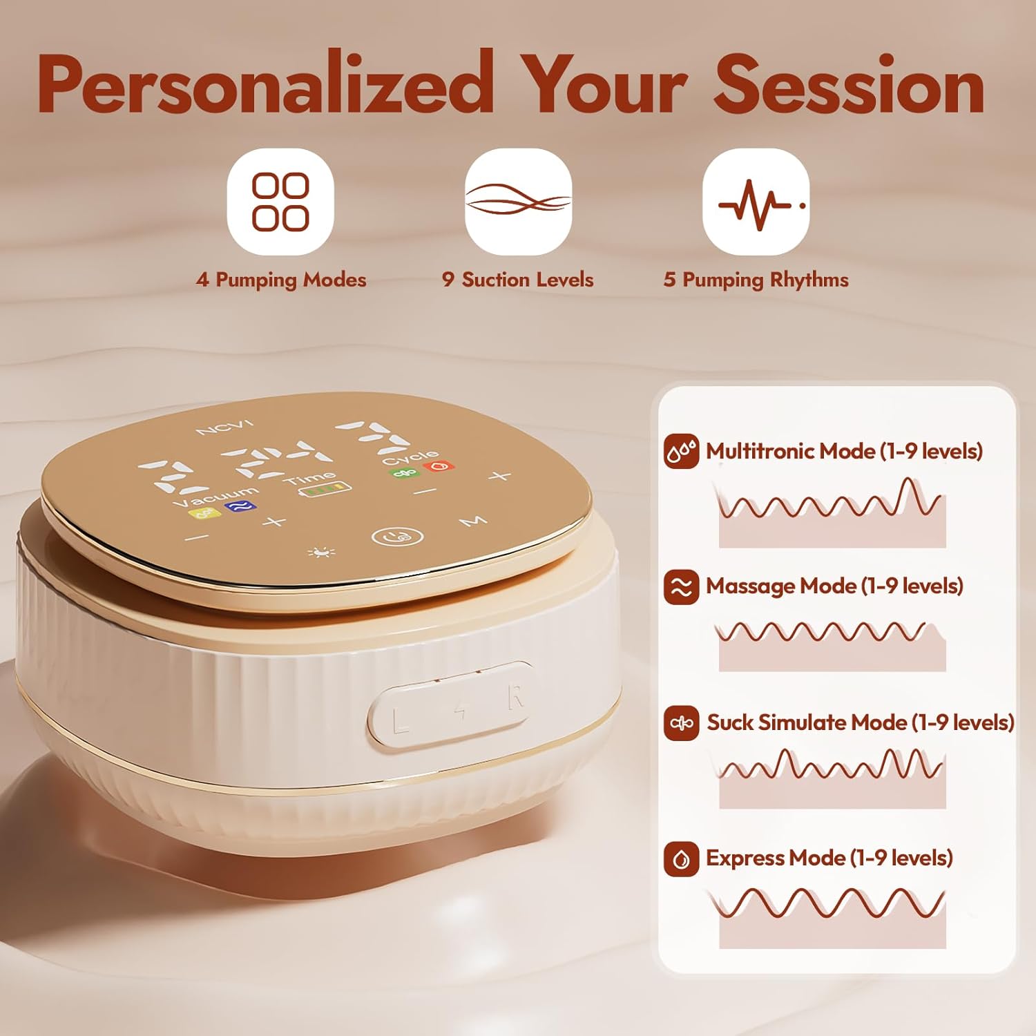 - Fully Customizable Pumping for Your Comfort: Featuring 4 modes (Massage, Simulation, and Multitronic, Expression) with 9 suction levels and 5 speed settings, this electric breast pump lets you personalize each session to match your flow and comfort. Great for moms with uneven milk production or sensitive breasts