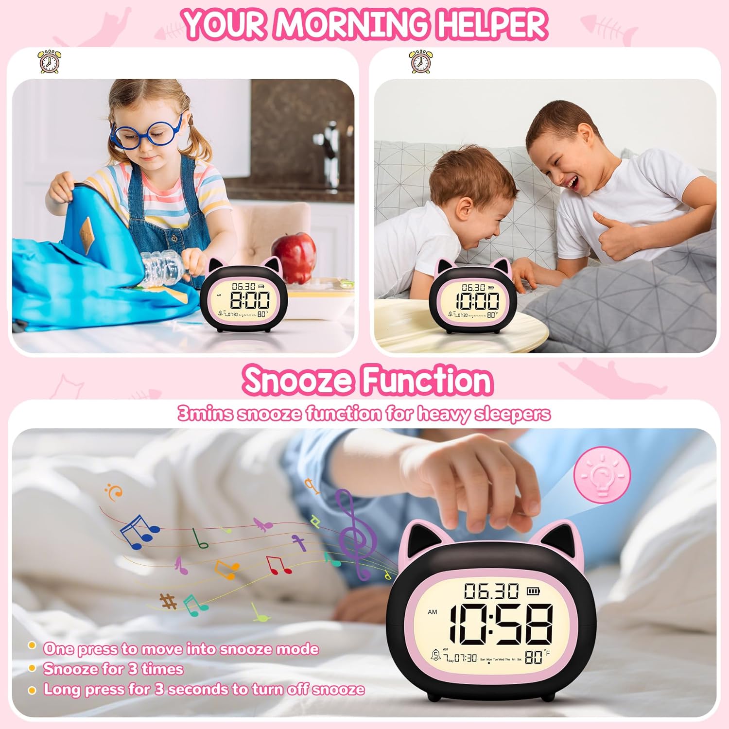 Kids Alarm Clock with Night Light for Kids, Small Digital Alarm Clocks for Bedrooms, Routine Builder, Cute Cat Alarm Clock with Sleep Training, Snooze, 12/24H, Date & Day, Temperature, USB Port